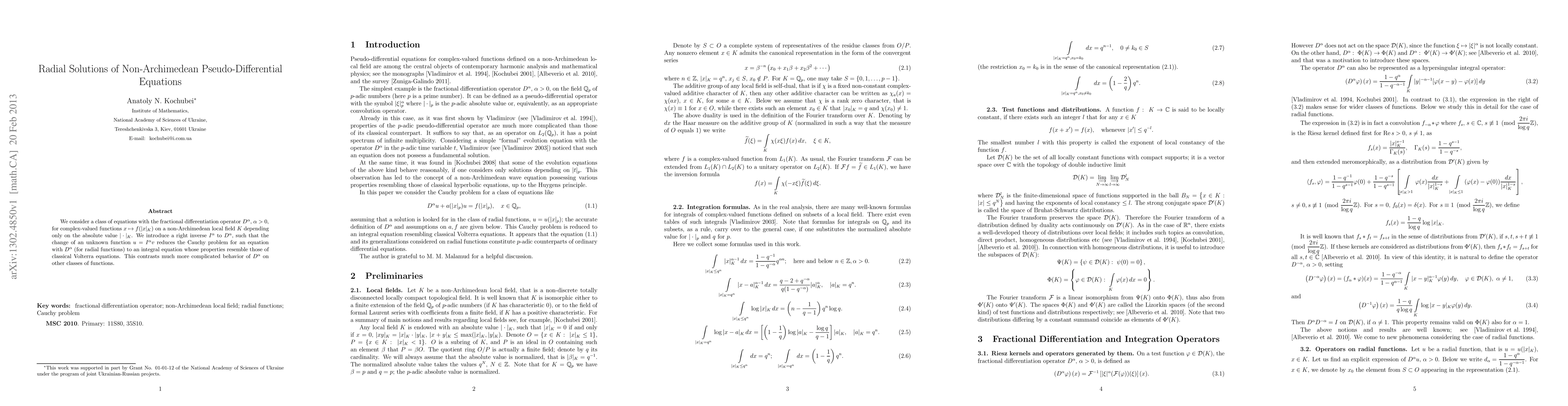 This paper explores non-Archimedean pseudo-differential equations involving fractional differentiation operators $D^\alpha$ for radial functions. It introduces a right inverse $I^\alpha$ to simplify the Cauchy problem, transforming it into an integral equation akin to classical Volterra equations, contrasting with the more complex behavior of $D^\alpha$ on other function classes.