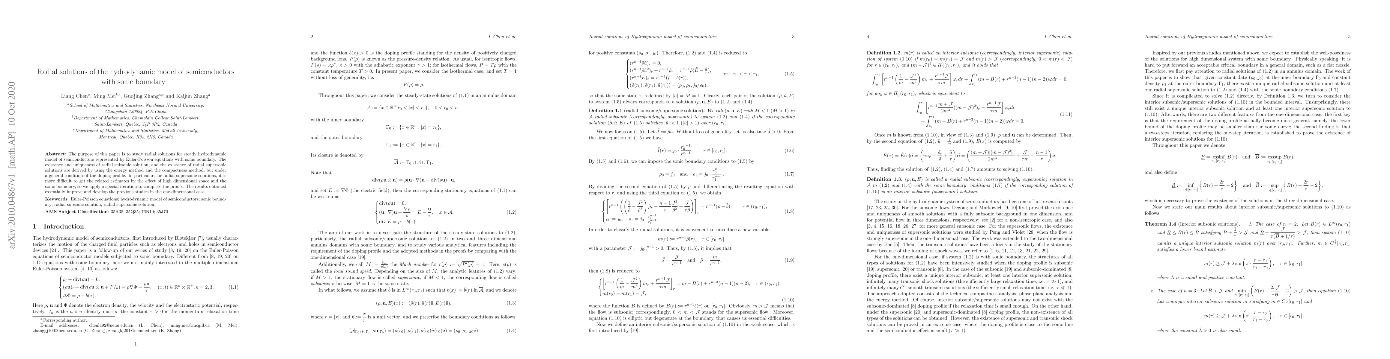 This paper investigates radial solutions for the steady hydrodynamic model of semiconductors, focusing on the existence and uniqueness of subsonic and supersonic solutions under a general doping profile. It employs the energy method and compactness method, with special iteration techniques to address high-dimensional space and sonic boundary effects, significantly advancing prior one-dimensional studies.