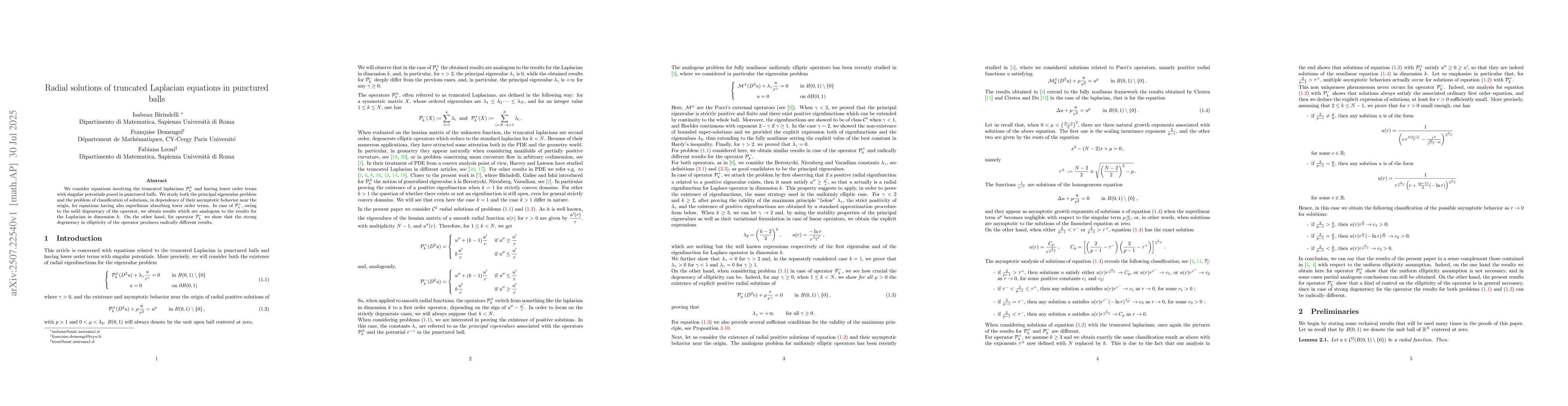 The paper develops a comprehensive analysis of radial solutions for truncated Laplacian equations in punctured balls, providing detailed results for both maximizing and minimizing operators, and establishing a variational framework for eigenvalue problems.