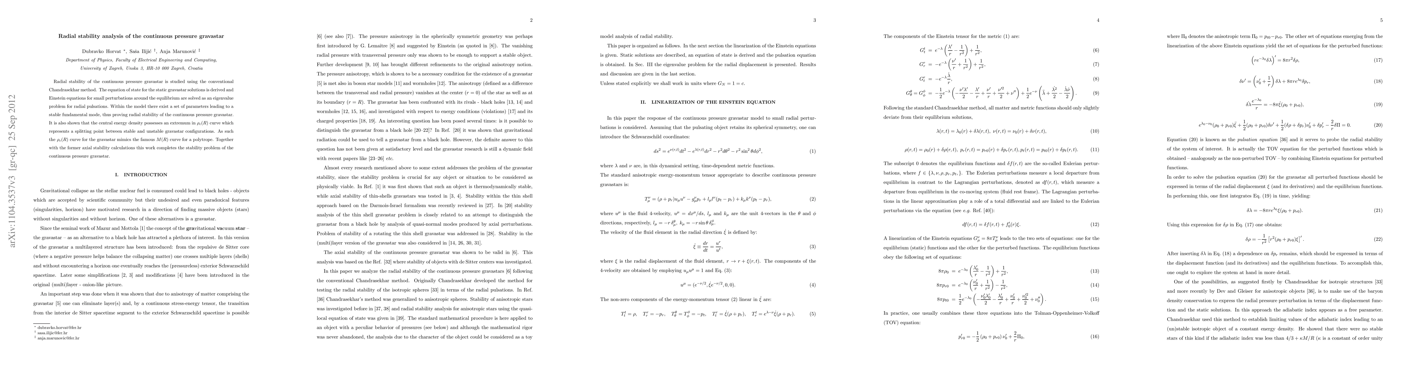 Radial stability of the continuous pressure gravastar is studied using the conventional Chandrasekhar method. The equation of state for the static gravastar solutions is derived and Einstein equations for small perturbations around the equilibrium are solved as an eigenvalue problem for radial pulsations. Within the model there exist a set of parameters leading to a stable fundamental mode, thus proving radial stability of the continuous pressure gravastar. It is also shown that the central energy density possesses an extremum in rho_c(R) curve which represents a splitting point between stable and unstable gravastar configurations. As such the rho_c(R) curve for the gravastar mimics the famous M(R) curve for a polytrope. Together with the former axial stability calculations this work completes the stability problem of the continuous pressure gravastar.