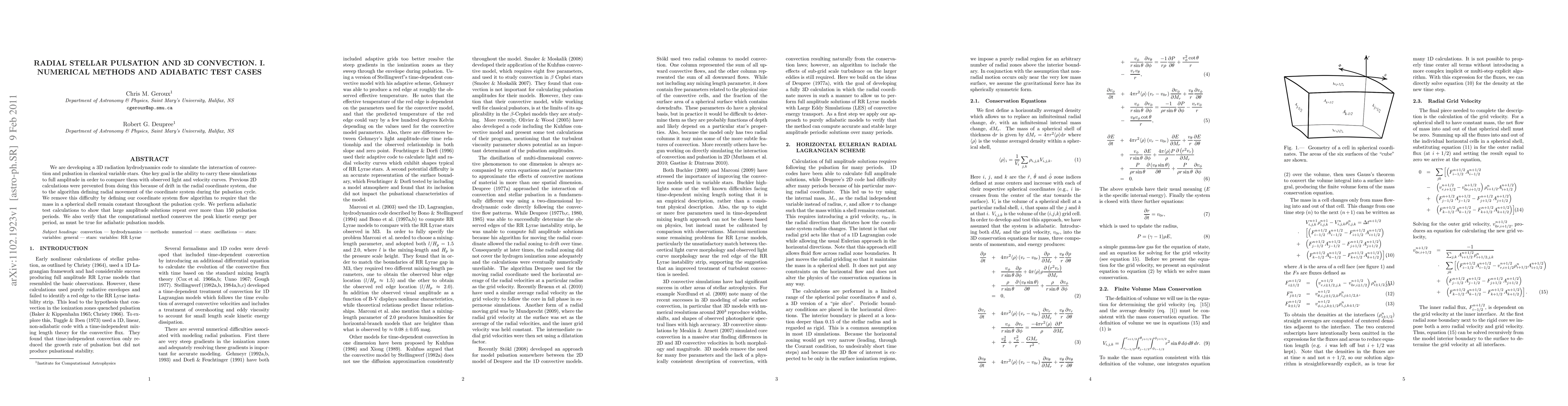 This paper develops a 3D radiation hydrodynamics code to simulate convection and pulsation in variable stars, addressing previous drift issues in 2D models by ensuring constant mass in spherical shells. Adiabatic test cases demonstrate stable, large amplitude solutions over 150 pulsation periods and confirm energy conservation.