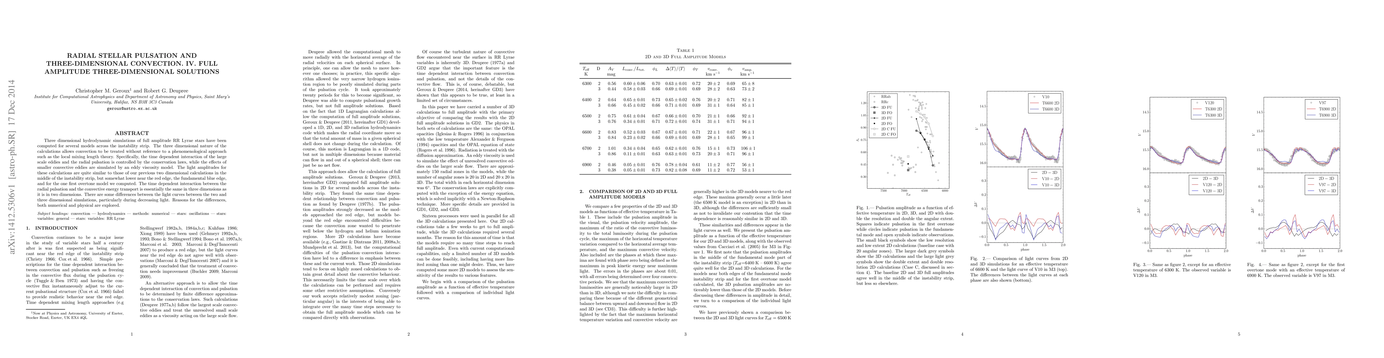 This paper presents three-dimensional hydrodynamic simulations of RR Lyrae stars' full amplitude pulsations, treating convection without phenomenological approaches. The study reveals similar light amplitudes to previous two-dimensional models but notes differences in light curves, particularly during decreasing light, with both numerical and physical reasons explored.