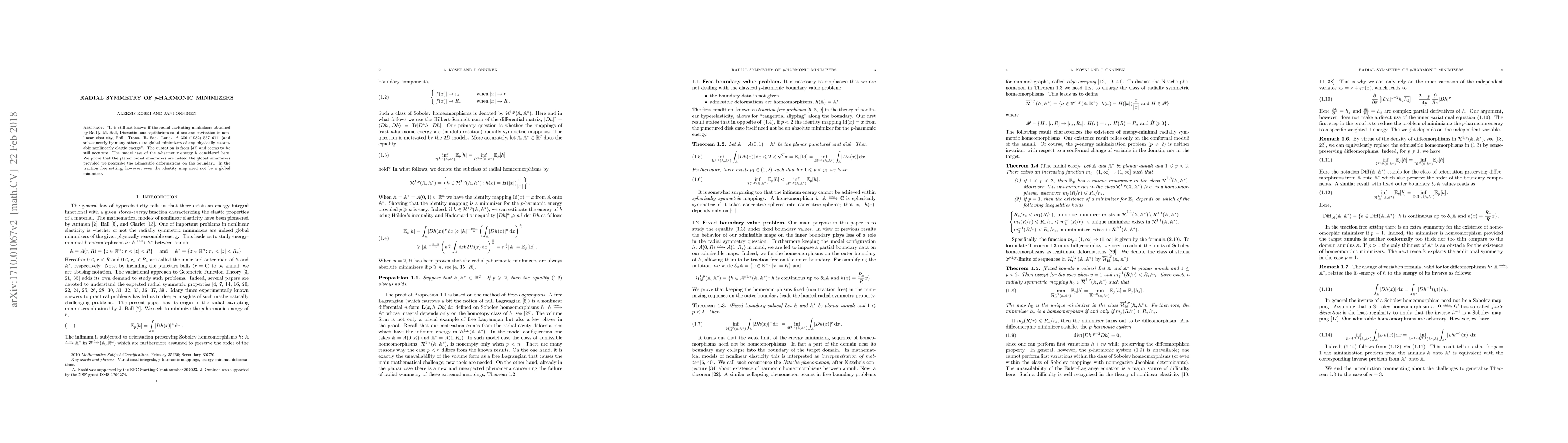 The paper proves that planar radial minimizers of $p$-harmonic energy are global minimizers when boundary deformations are prescribed, but not in traction-free settings.