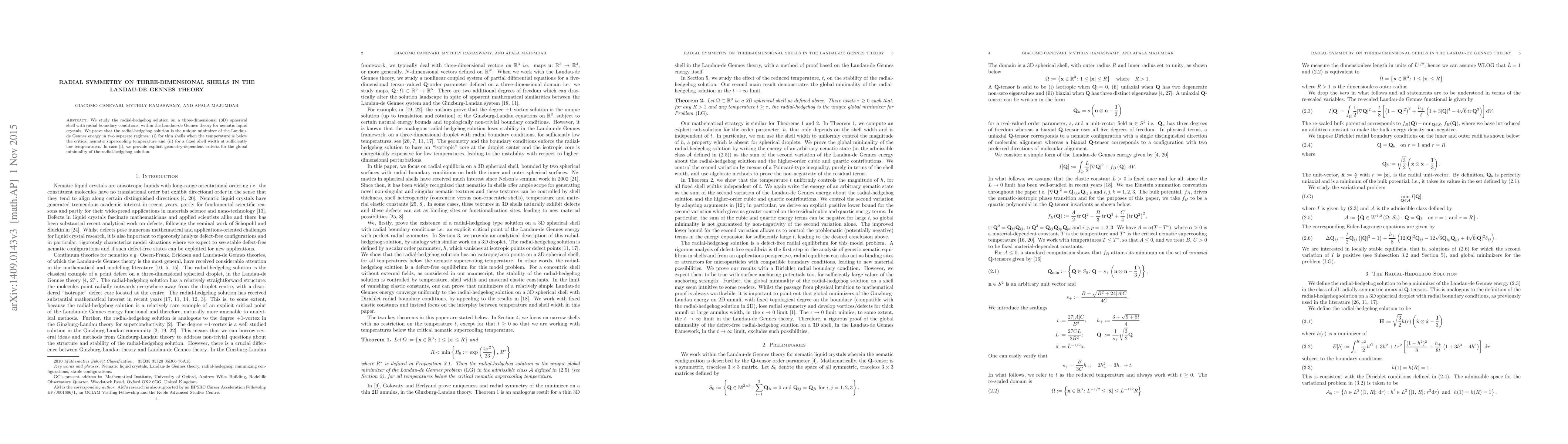 This paper investigates the stability and uniqueness of the radial-hedgehog solution in the Landau-de Gennes theory for nematic liquid crystals on a 3D spherical shell. It demonstrates that the radial-hedgehog solution is the unique global energy minimizer for sufficiently narrow shells below the nematic supercooling temperature, providing explicit geometry-dependent criteria for this minimality.