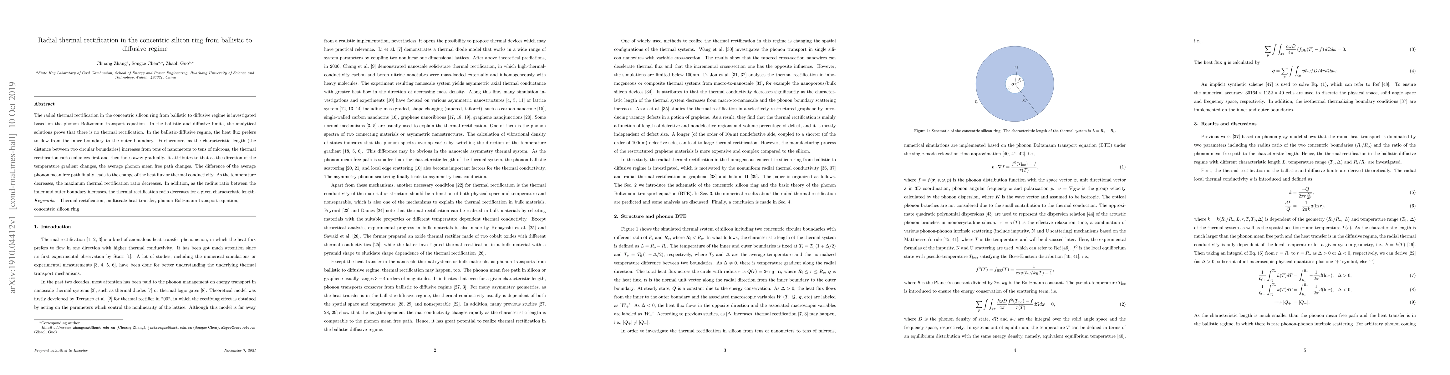 This paper investigates radial thermal rectification in concentric silicon rings across ballistic and diffusive regimes using the phonon Boltzmann transport equation. It finds that while no rectification occurs in the ballistic or diffusive regimes alone, the ballistic-diffusive regime exhibits heat flux flowing from the inner to the outer boundary. The thermal rectification ratio increases with characteristic length but diminishes at larger scales, influenced by changes in the average phonon mean free path.