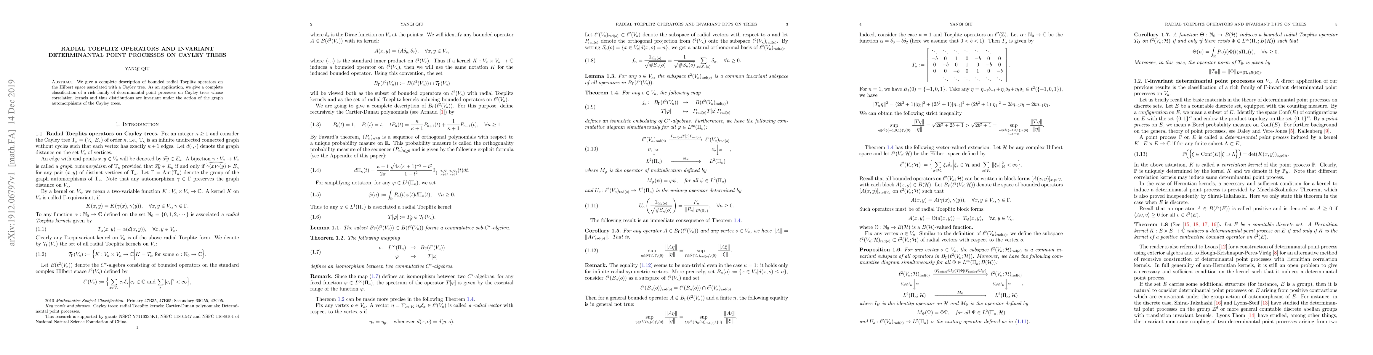This paper provides a detailed analysis of bounded radial Toeplitz operators on the Hilbert space linked to Cayley trees and classifies a family of invariant determinantal point processes on these trees, characterized by correlation kernels invariant under graph automorphisms.