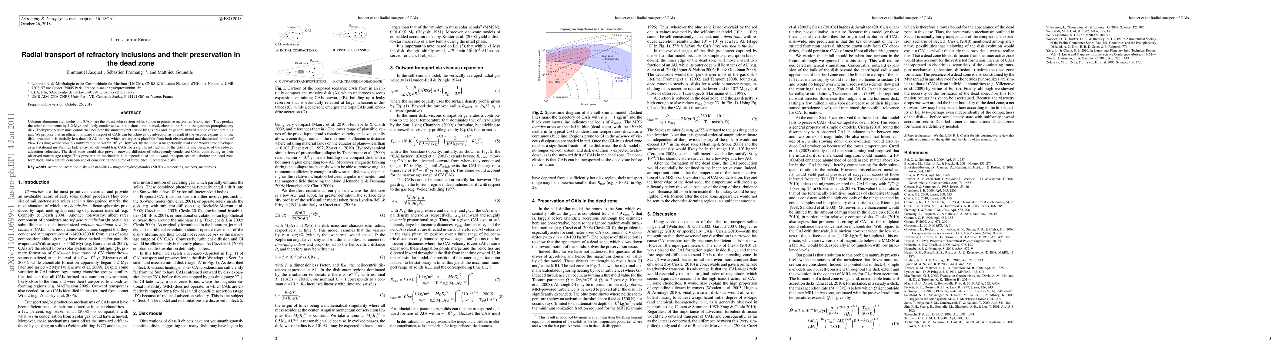 Calcium-aluminum-rich inclusions (CAIs) are the oldest solar system solids known in primitive meteorites (chondrites). They predate the other components by 1-2 Myr, and likely condensed within a short time interval, close to the Sun in the gaseous protoplanetary disk. Their preservation must counterbalance both the sunward drift caused by gas drag and the general inward motion of the entraining gas. We propose that an efficient outward transport of CAIs can be achieved by advection as a result of the viscous expansion of the disk, provided it is initially less than 10 AU in size, which we argue is plausible from both observational and theoretical points of view. Gas drag would stop this outward motion within $10^5$ yr. However, by that time, a magnetically dead zone would have developed as gravitational instabilities fade away, which would trap CAIs for a significant fraction of the disk lifetime because of the reduced advection velocities. The dead zone would also prevent outward diffusion of subsequently condensed CAIs, contributing to their observed narrow age range. This preservation mechanism is independent of the outward transport scenario (before the dead zone formation) and a natural consequence of considering the source of turbulence in accretion disks.