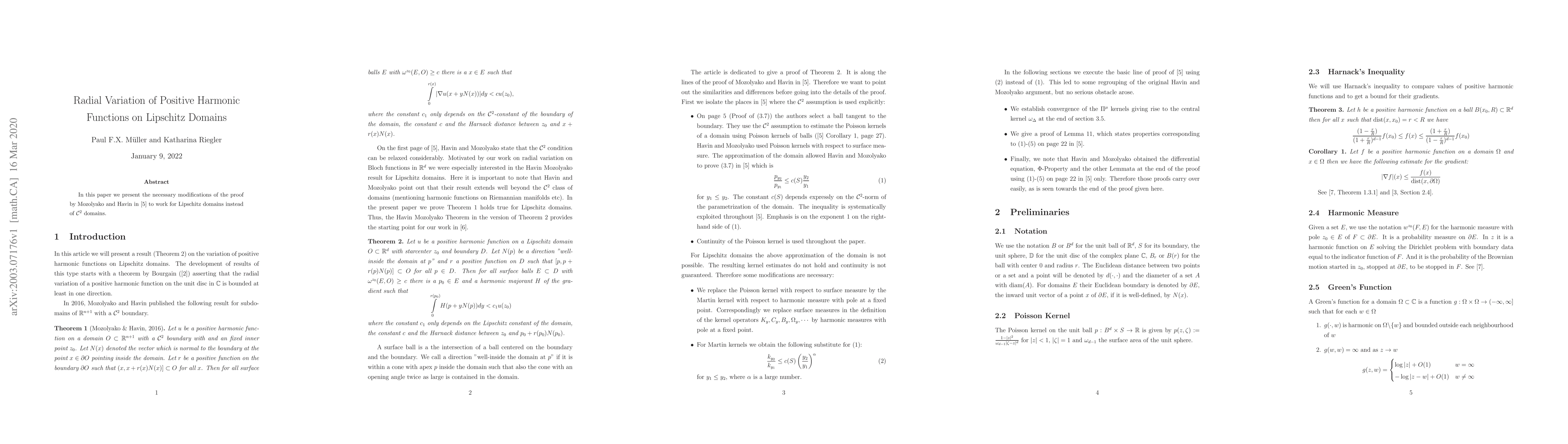 Summary: This paper adapts the proof techniques of Mozolyako and Havin to demonstrate the radial variation properties of positive harmonic functions within Lipschitz domains, extending beyond the $\mathcal{C}^2$ domain constraints.