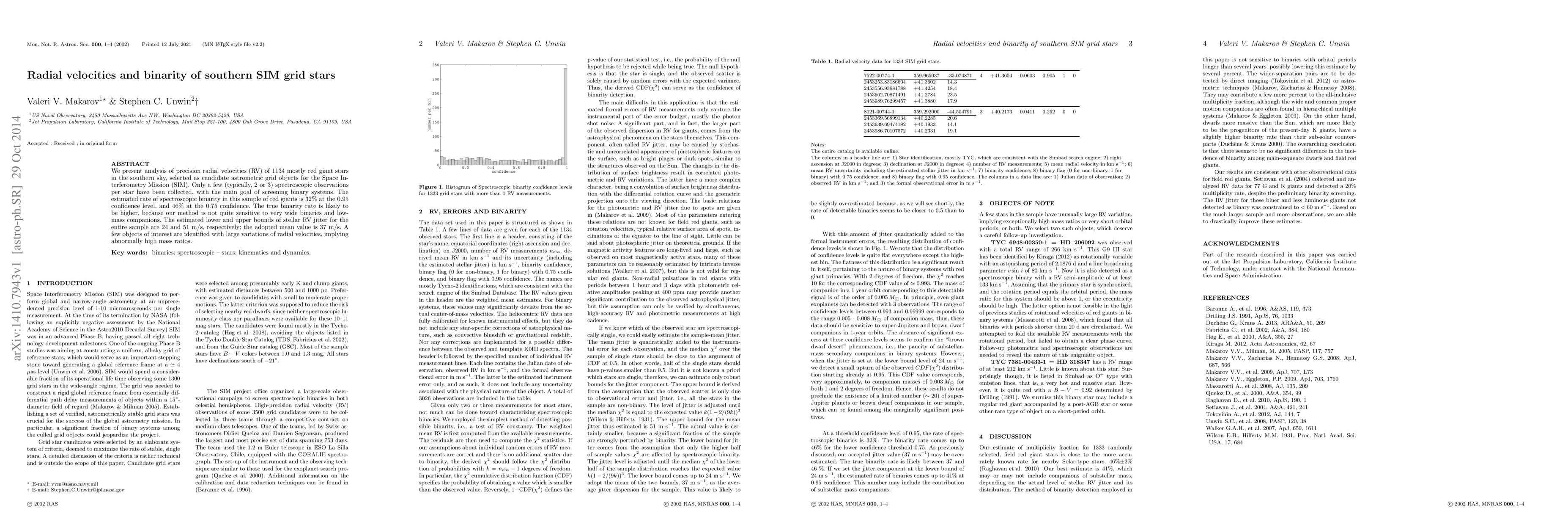 This paper analyzes radial velocities of 1134 red giant stars selected for the SIM mission, finding a spectroscopic binarity rate of 32% to 46%. The study suggests the true binarity rate may be higher due to limitations in detecting wide binaries and low-mass companions.