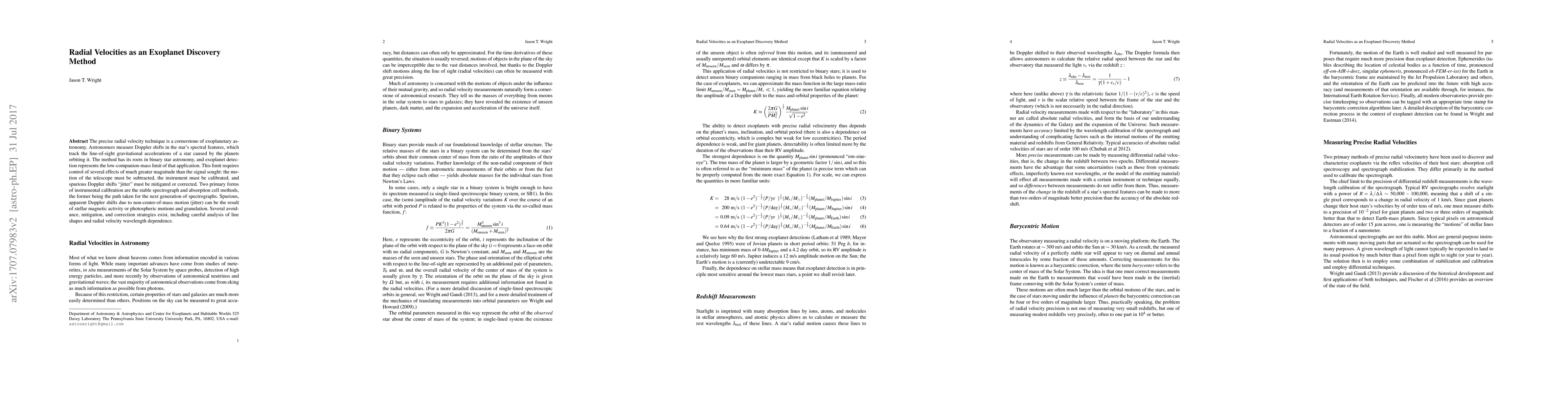 The precise radial velocity technique is a cornerstone of exoplanetary astronomy. Astronomers measure Doppler shifts in the star's spectral features, which track the line-of/sight gravitational accelerations of a star caused by the planets orbiting it. The method has its roots in binary star astronomy, and exoplanet detection represents the low-companion-mass limit of that application. This limit requires control of several effects of much greater magnitude than the signal sought: the motion of the telescope must be subtracted, the instrument must be calibrated, and spurious Doppler shifts "jitter" must be mitigated or corrected. Two primary forms of instrumental calibration are the stable spectrograph and absorption cell methods, the former being the path taken for the next generation of spectrographs. Spurious, apparent Doppler shifts due to non-center-of-mass motion (jitter) can be the result of stellar magnetic activity or photospheric motions and granulation. Several avoidance, mitigation, and correction strategies exist, including careful analysis of line shapes and radial velocity wavelength dependence.