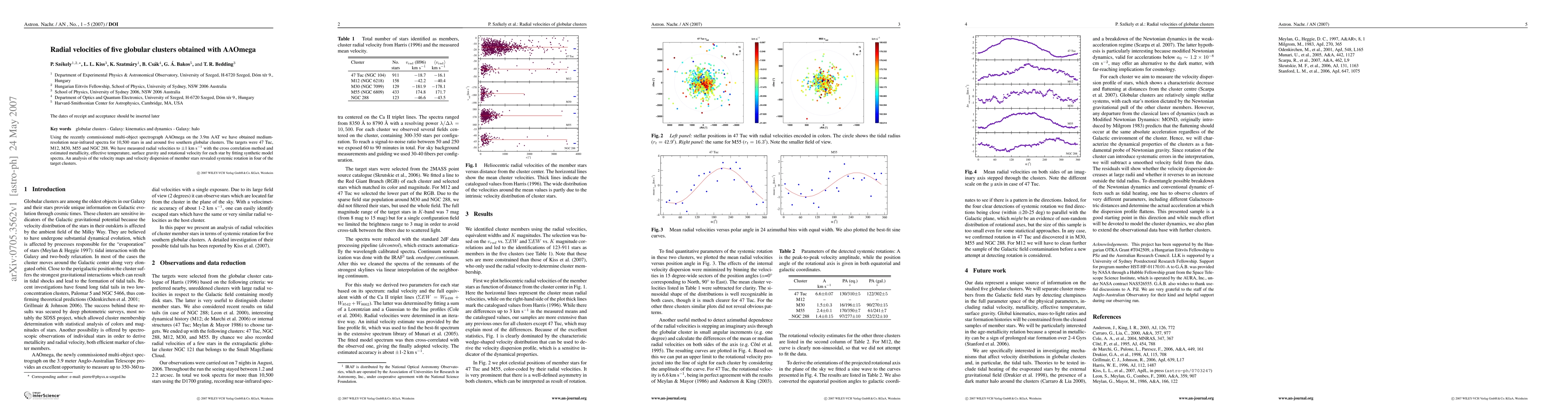 Using the recently commissioned multi-object spectrograph AAOmega on the 3.9m AAT we have obtained medium-resolution near-infrared spectra for 10,500 stars in and around five southern globular clusters. The targets were 47 Tuc, M12, M30, M55 and NGC 288. We have measured radial velocities to +/- 1 km/s with the cross correlation method and estimated metallicity, effective temperature, surface gra vity and rotational velocity for each star by fitting synthetic model spectra. An analysis of the velocity maps and velocity dispersion of member stars revealed systemic rotation in four of the target clusters.