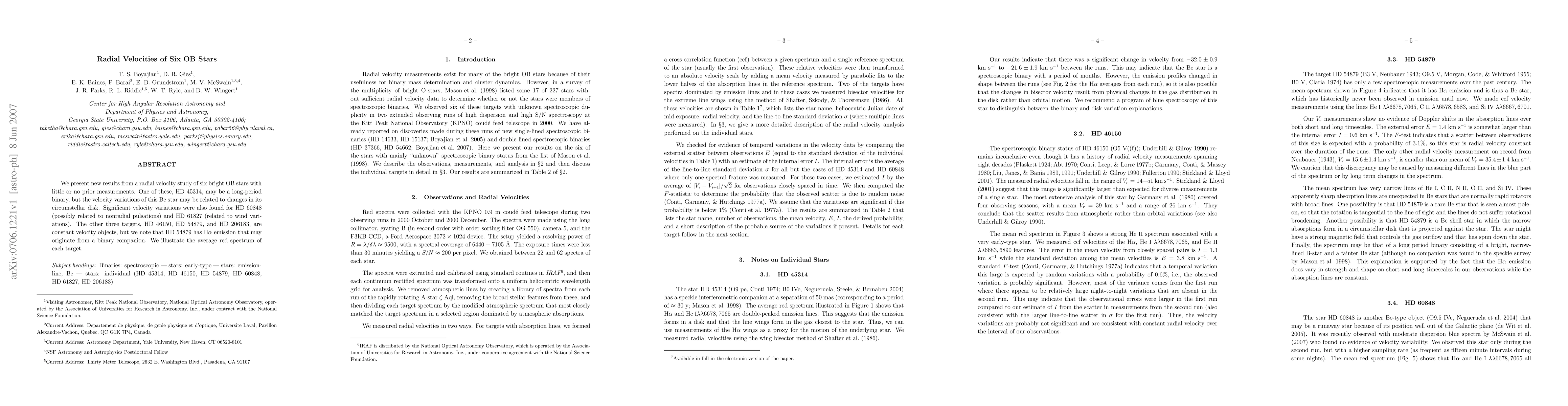 We present new results from a radial velocity study of six bright OB stars with little or no prior measurements. One of these, HD 45314, may be a long-period binary, but the velocity variations of this Be star may be related to changes in its circumstellar disk. Significant velocity variations were also found for HD 60848 (possibly related to nonradial pulsations) and HD 61827 (related to wind variations). The other three targets, HD 46150, HD 54879, and HD 206183, are constant velocity objects, but we note that HD 54879 has H$\alpha$ emission that may originate from a binary companion. We illustrate the average red spectrum of each target.