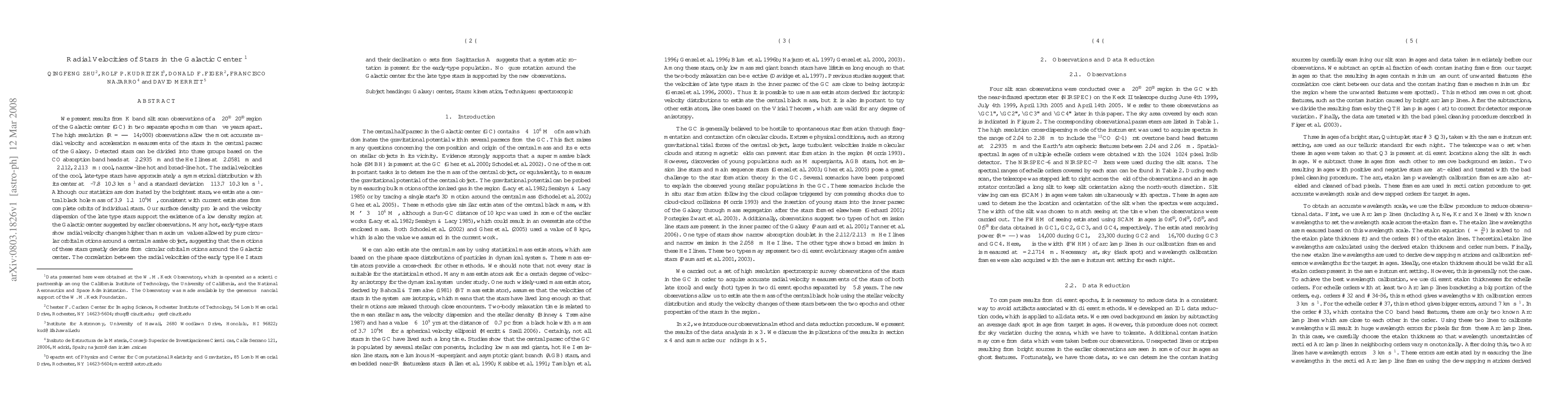 This study presents high-resolution radial velocity measurements of stars in the Galactic Center, revealing a central black hole mass of 3.9(±1.1) million solar masses. The data indicate significant deviations from circular orbits for many hot stars, suggesting non-circular motion patterns.