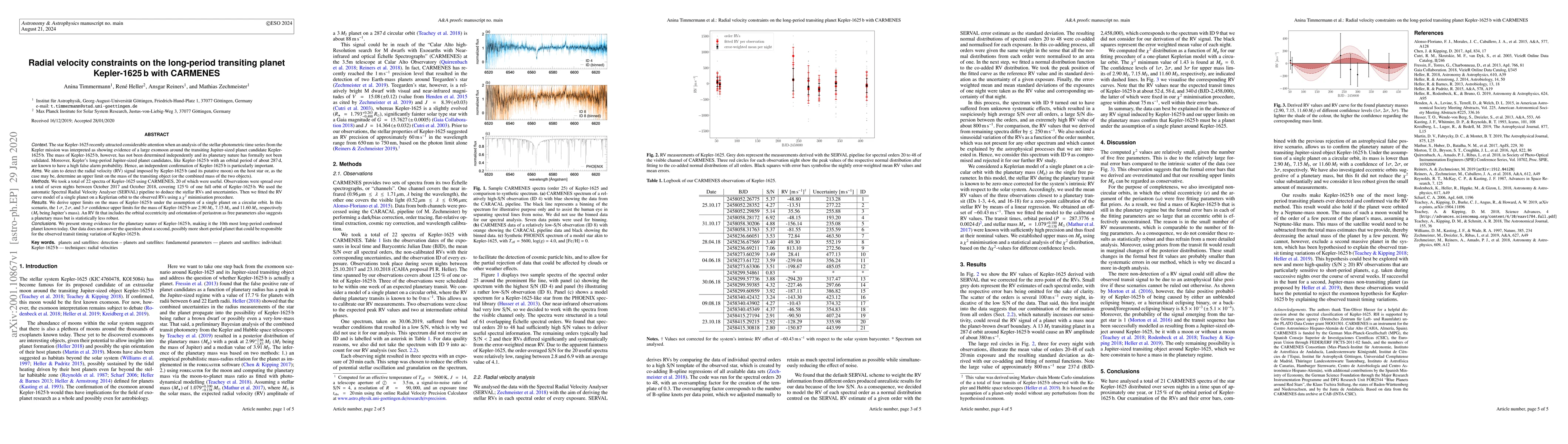 This paper uses CARMENES spectra to detect the radial velocity signal of Kepler-1625b, confirming its planetary nature and setting upper limits on its mass. The findings establish Kepler-1625b as the 10th longest-period confirmed planet, but do not provide evidence for a hypothesized exomoon or a secondary planet.