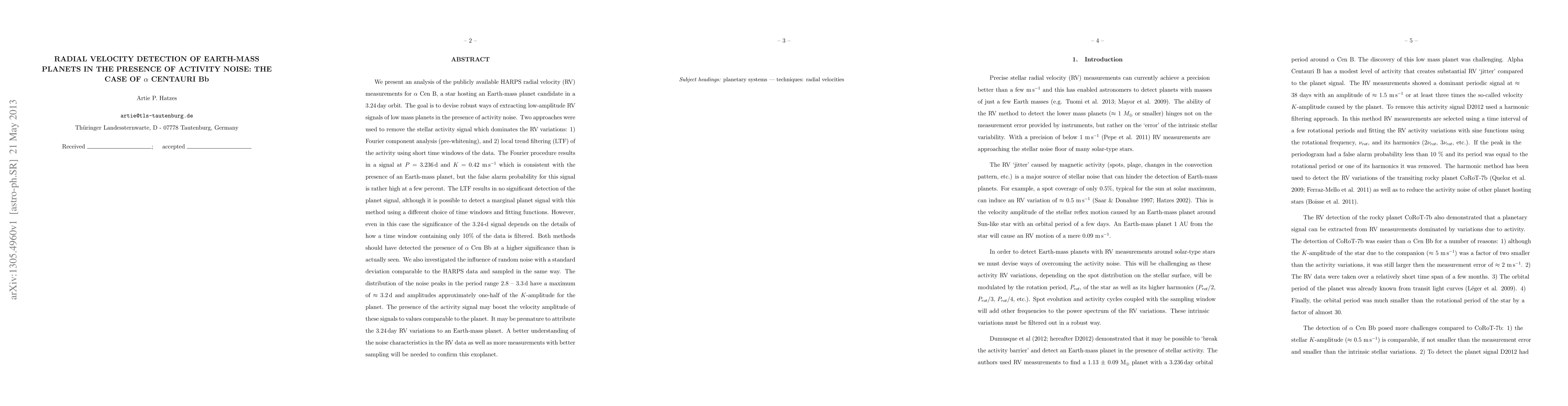 We present an analysis of the publicly available HARPS radial velocity (RV) measurements for Alpha Cen B, a star hosting an Earth-mass planet candidate in a 3.24 day orbit. The goal is to devise robust ways of extracting low-amplitude RV signals of low mass planets in the presence of activity noise. Two approaches were used to remove the stellar activity signal which dominates the RV variations: 1) Fourier component analysis (pre-whitening), and 2) local trend filtering (LTF) of the activity using short time windows of the data. The Fourier procedure results in a signal at P = 3.236 days and K = 0.42 m/s which is consistent with the presence of an Earth-mass planet, but the false alarm probability for this signal is rather high at a few percent. The LTF results in no significant detection of the planet signal, although it is possible to detect a marginal planet signal with this method using a different choice of time windows and fitting functions. However, even in this case the significance of the 3.24-d signal depends on the details of how a time window containing only 10% of the data is filtered. Both methods should have detected the presence of Alpha Cen Bb at a higher significance than is actually seen. We also investigated the influence of random noise with a standard deviation comparable to the HARPS data and sampled in the same way. The distribution of the noise peaks in the period range 2.8 - 3.3 days have a maximum of approximately 3.2 days and amplitudes approximately one-half of the K-amplitude for the planet. The presence of the activity signal may boost the velocity amplitude of these signals to values comparable to the planet. It may be premature to attribute the 3.24 day RV variations to an Earth-mass planet. A better understanding of the noise characteristics in the RV data as well as more measurements with better sampling will be needed to confirm this exoplanet.