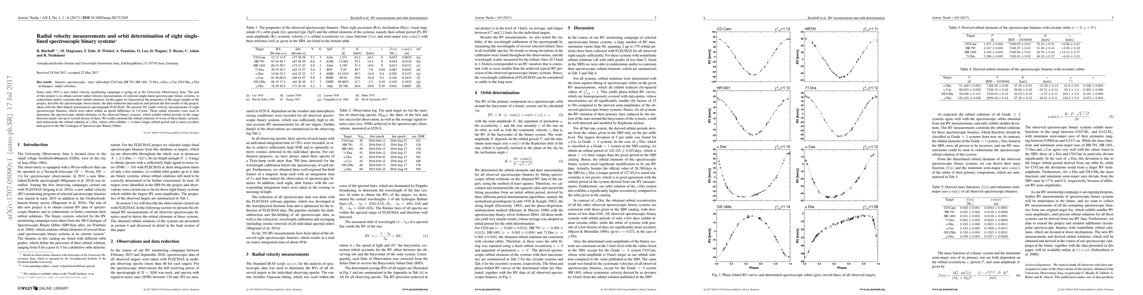 Since early 2015 a new radial velocity monitoring campaign is going on at the University Observatory Jena. The aim of this project is to obtain current radial velocity measurements of selected single-lined spectroscopic binary systems, to redetermine and/or constrain their orbital solutions. In this paper we characterize the properties of the target sample of the project, describe the spectroscopic observations, the data-reduction and analysis and present the first results of the project, taken with the fiber-linked astronomical spectrograph FLECHAS. We present 391 radial velocity measurements of eight spectroscopic binaries, which were taken within an epoch difference of 1.6 years. These radial velocities were used to determine the spectroscopic orbital elements of the observed binary systems, which exhibit orbital periods in the range between nearly one up to several dozens of days. We could constrain the orbital solutions of seven of these binary systems, and redetermine the orbital solution of phi Dra, whose orbit exhibits >4 times longer orbital period and is more eccentric than given in the 9th Catalogue of Spectroscopic Binary Orbits.
