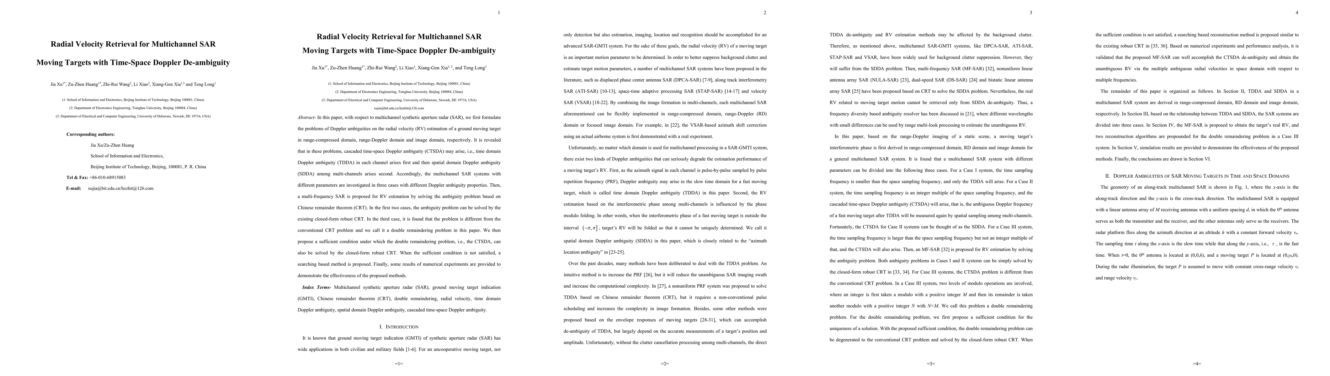 In this paper, with respect to multichannel synthetic aperture radars (SAR), we first formulate the problems of Doppler ambiguities on the radial velocity (RV) estimation of a ground moving target in range-compressed domain, range-Doppler domain and image domain, respectively. It is revealed that in these problems, a cascaded time-space Doppler ambiguity (CTSDA) may encounter, i.e., time domain Doppler ambiguity (TDDA) in each channel arises first and then spatial domain Doppler ambiguity (SDDA) among multi-channels arises second. Accordingly, the multichannel SAR systems with different parameters are investigated in three different cases with diverse Doppler ambiguity properties, and a multi-frequency SAR is then proposed to obtain the RV estimation by solving the ambiguity problem based on Chinese remainder theorem (CRT). In the first two cases, the ambiguity problem can be solved by the existing closed-form robust CRT. In the third case, it is found that the problem is different from the conventional CRT problems and we call it a double remaindering problem in this paper. We then propose a sufficient condition under which the double remaindering problem, i.e., the CTSDA, can also be solved by the closed-form robust CRT. When the sufficient condition is not satisfied for a multi-channel SAR, a searching based method is proposed. Finally, some results of numerical experiments are provided to demonstrate the effectiveness of the proposed methods.