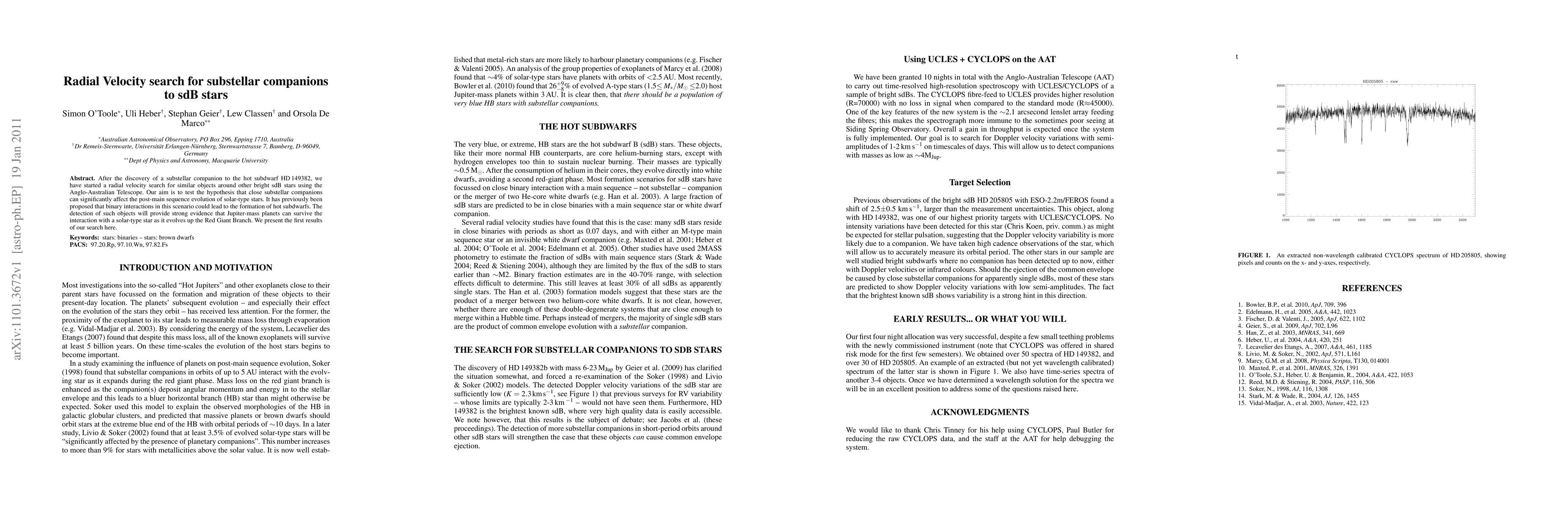 This paper reports on a radial velocity search for substellar companions around bright sdB stars using the Anglo-Australian Telescope, aiming to test if such companions influence the evolution of solar-type stars. Initial findings suggest the potential survival of Jupiter-mass planets through the interaction with evolving stars.