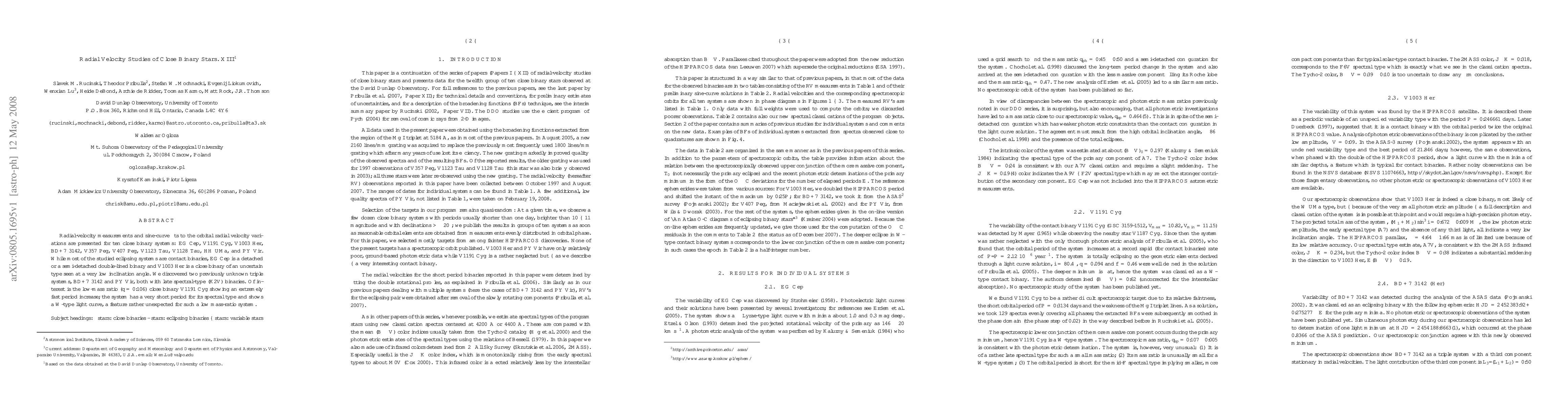 Radial-velocity measurements and sine-curve fits to the orbital radial velocity variations are presented for ten close binary systems: EG Cep,V1191 Cyg, V1003 Her, BD+7_3142, V357 Peg, V407 Peg, V1123 Tau, V1128 Tau, HH UMa, and PY Vir. While most of the studied eclipsing systems are contact binaries, EG Cep is a detached or a semi-detached double-lined binary and V1003 Her is a close binary of an uncertain type seen at a very low inclination angle. We discovered two previously unknown triple systems, BD+7_3142 and PY Vir, both with late spectral-type (K2V) binaries. Of interest is the low-mass ratio (q = 0.106) close binary V1191 Cyg showing an extremely fast period increase; the system has a very short period for its spectral type and shows a W-type light curve, a feature rather unexpected for such a low mass-ratio system.