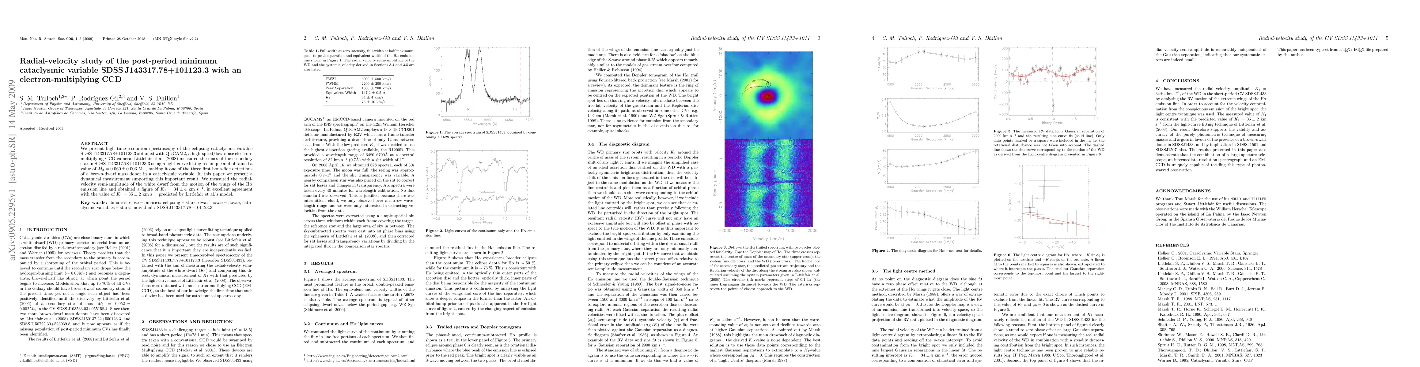 We present high time-resolution spectroscopy of the eclipsing cataclysmic variable SDSSJ143317.78+101123.3 obtained with QUCAM2, a high-speed/low-noise electron-multiplying CCD camera. Littlefair et al. measured the mass of the secondary star in SDSSJ143317.78+101123.3 using a light-curve fitting technique and obtained a value of M2=0.060+/-0.003 Msun, making it one of the three first bona-fide detections of a brown-dwarf mass donor in a cataclysmic variable. In this paper we present a dynamical measurement supporting this important result. We measured the radial-velocity semi-amplitude of the white dwarf from the motion of the wings of the Halpha emission line and obtained a figure of K1=34+/-4 km/s, in excellent agreement with the value of K1=35+/-2 km/s predicted by Littlefair et al.'s model.