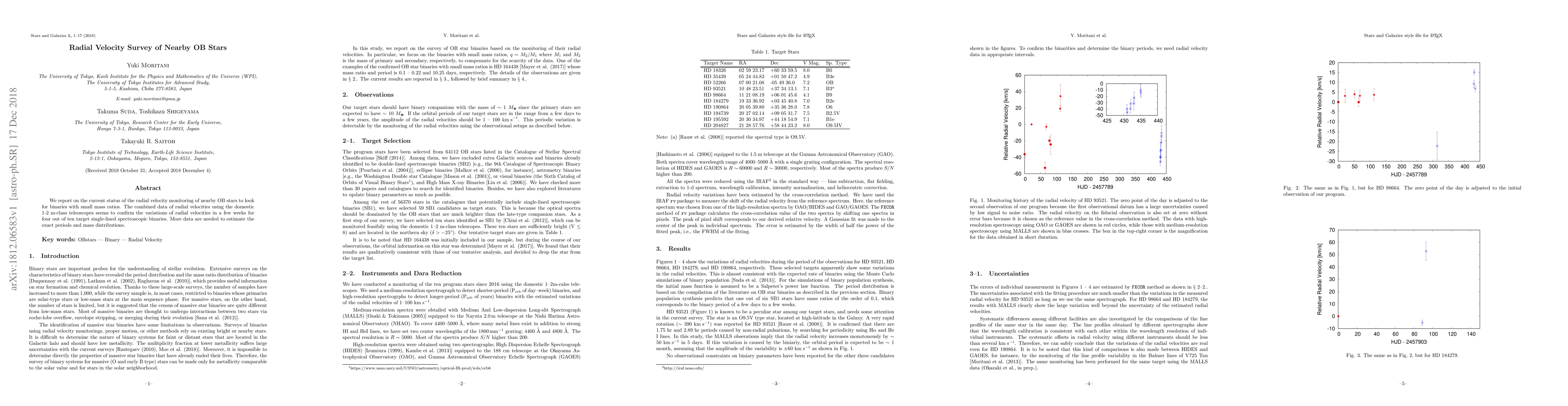 We report on the current status of the radial velocity monitoring of nearby OB stars to look for binaries with small mass ratios. The combined data of radial velocities using the domestic 1-2 m-class telescopes seems to confirm the variations of radial velocities in a few weeks for four out of ten target single-lined spectroscopic binaries. More data are needed to estimate the exact periods and mass distributions.