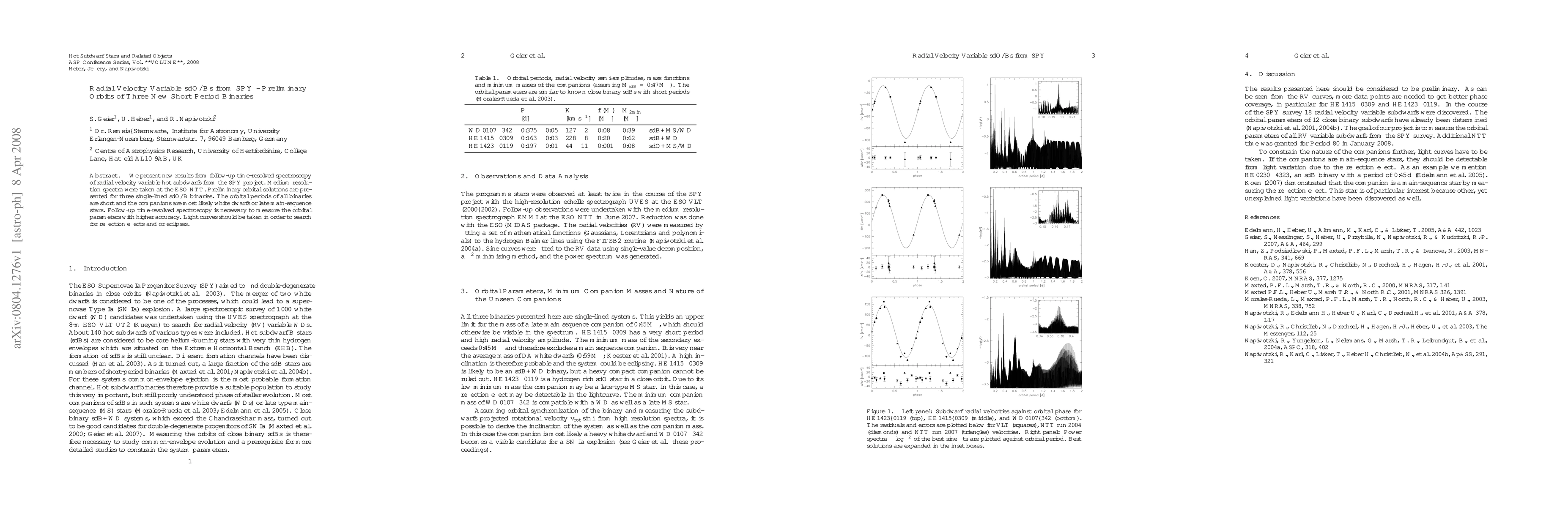 This paper reports on new radial velocity measurements of three short-period sdO/B binaries identified in the SPY project, revealing likely white dwarf or late main-sequence companions. Preliminary orbital solutions suggest short orbital periods, with further spectroscopic and photometric observations needed to refine these parameters and explore potential reflection effects or eclipses.
