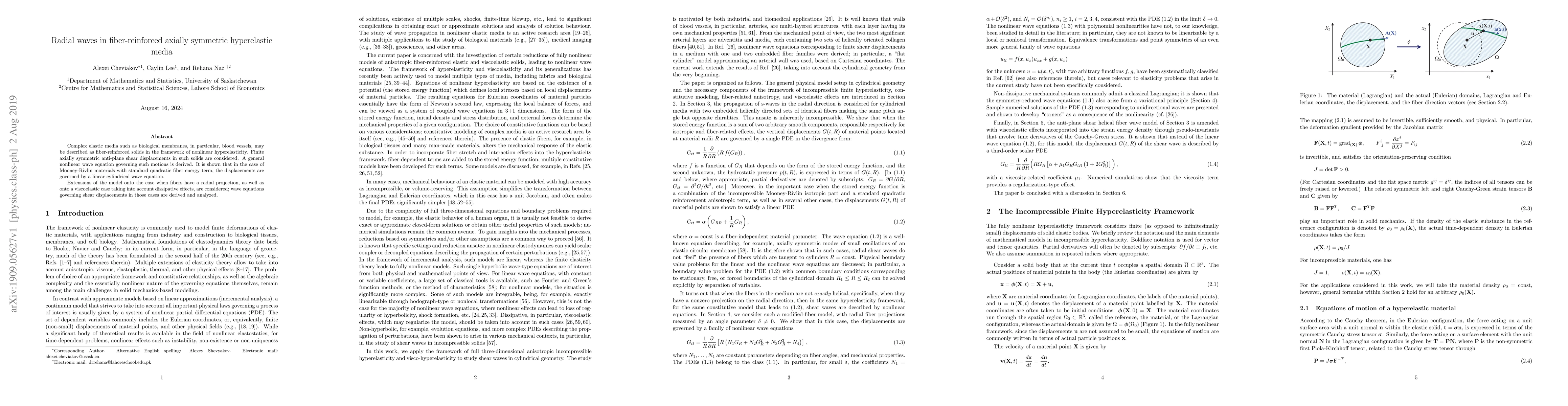 This paper derives a nonlinear wave equation for finite axially symmetric anti-plane shear displacements in fiber-reinforced hyperelastic media, showing that for Mooney-Rivlin materials, these displacements follow a linear cylindrical wave equation. It also extends the model to include radial fiber projections and viscoelastic effects, deriving and analyzing the corresponding wave equations.