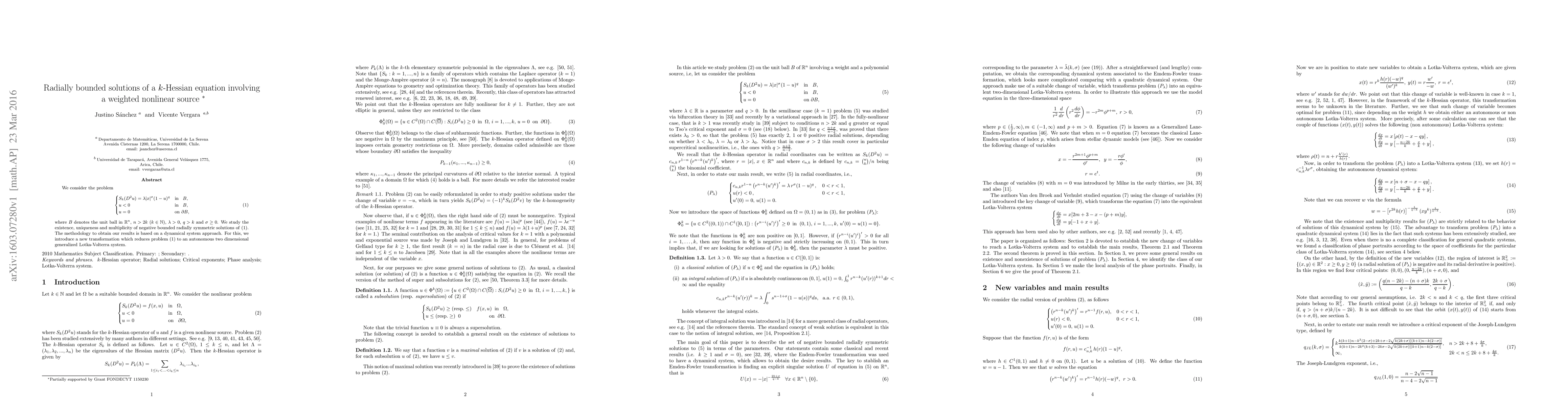 We consider the problem \begin{equation}(1)\;\;\; \begin{cases} S_k(D^2u)= \lambda |x|^{\sigma} (1-u)^q &\mbox{in }\;\; B,\\ u <0 & \mbox{in }\;\; B,\\ u=0 &\mbox{on }\partial B, \end{cases} \end{equation} where $B$ denotes the unit ball in $\mathbb{R}^n$, $n>2k$ ($k\in \mathbb{N}$), $\lambda>0$, $q > k$ and $\sigma\geq 0$. We study the existence, uniqueness and multiplicity of negative bounded radially symmetric solutions of (1). The methodology to obtain our results is based on a dynamical system approach. For this, we introduce a new transformation which reduces problem (1) to an autonomous two dimensional generalized Lotka-Volterra system.