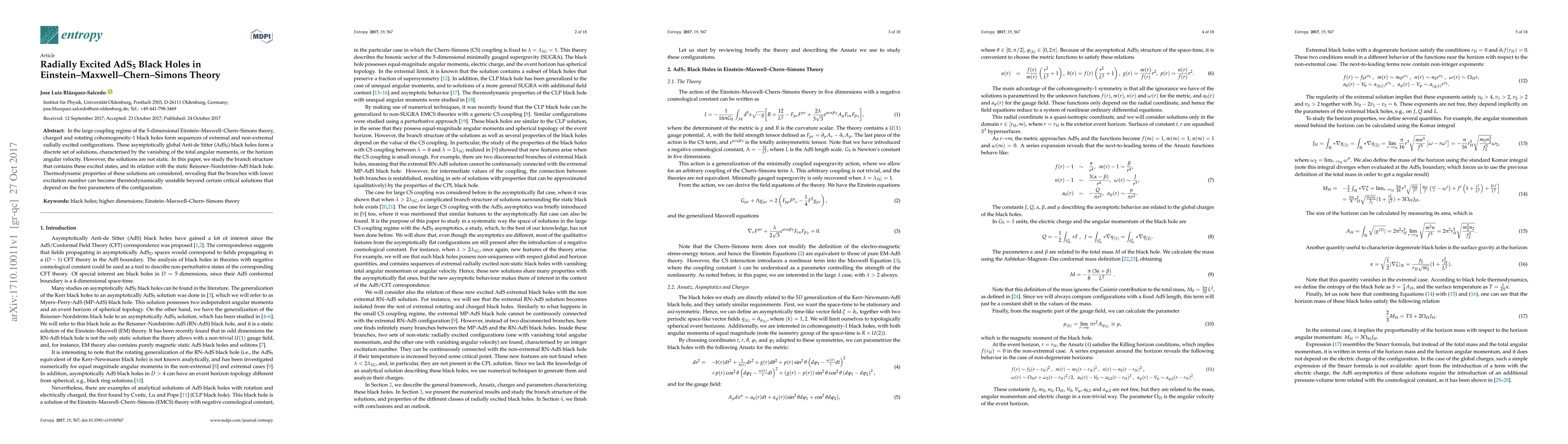 This paper investigates radially excited 5-dimensional AdS$_5$ black holes in Einstein-Maxwell-Chern-Simons theory, revealing sequences of charged, rotating, and non-static solutions characterized by vanishing angular momenta. The study explores the thermodynamic stability of these excited states, showing that lower excitation branches become unstable beyond specific critical points related to the theory's parameters.