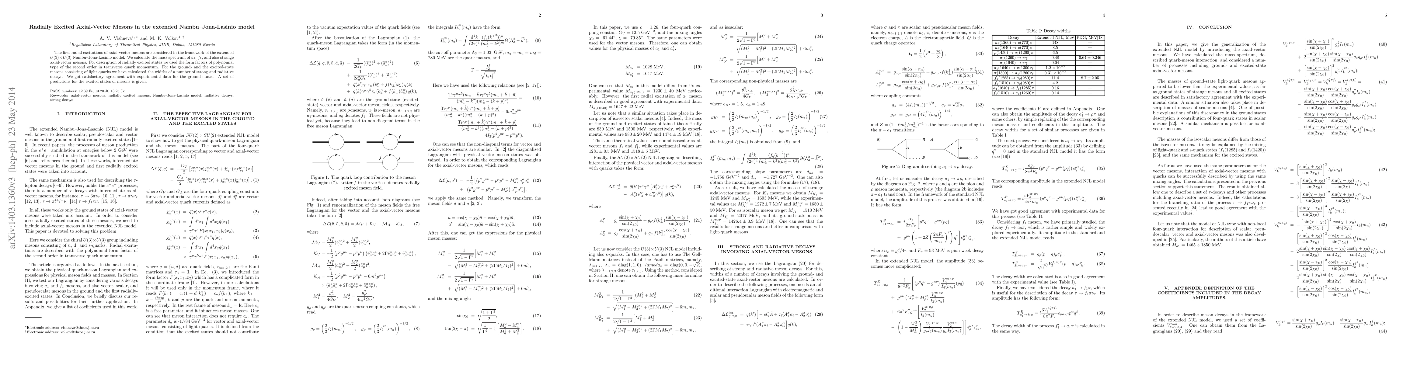This paper explores the first radial excitations of axial-vector mesons within the extended Nambu-Jona-Lasinio model, calculating the mass spectrum and decay widths for $a_1$, $f_1$, and strange axial-vector mesons, and achieving good agreement with experimental data for ground states while providing predictions for excited states.