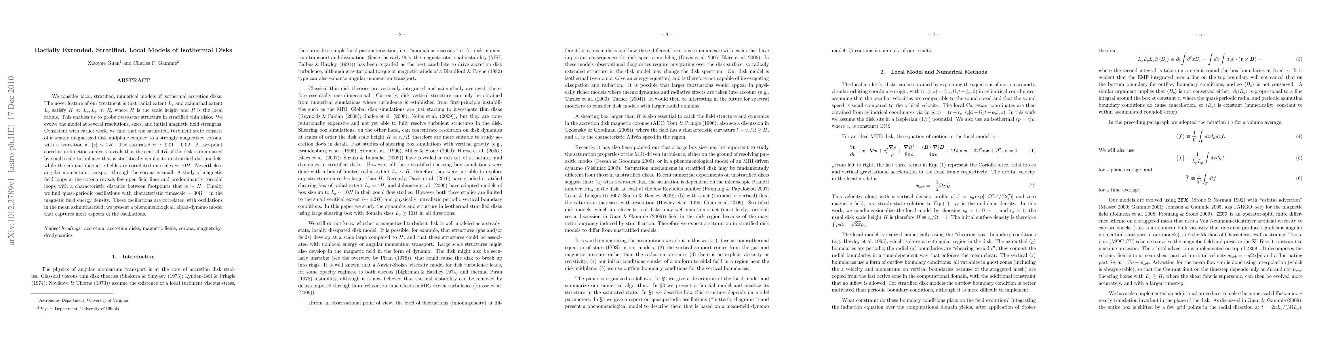 We consider local, stratified, numerical models of isothermal accretion disks. The novel feature of our treatment is that radial extent L_x and azimuthal extent L_y satisfy H << L_x, L_y << R, where H is the scale height and R is the local radius. This enables us to probe mesoscale structure in stratified thin disks. We evolve the model at several resolutions, sizes, and initial magnetic field strengths. Consistent with earlier work, we find that the saturated, turbulent state consists of a weakly magnetized disk midplane coupled to a strongly magnetized corona, with a transition at |z| ~ 2H. The saturated \alpha ~ 0.01 - 0.02. A two-point correlation function analysis reveals that the central 4H of the disk is dominated by small scale turbulence that is statistically similar to unstratified disk models, while the coronal magnetic fields are correlated on scales ~ 10 H. Nevertheless angular momentum transport through the corona is small. A study of magnetic field loops in the corona reveals few open field lines and predominantly toroidal loops with a characteristic distance between footpoints that is ~ H. Finally we find quasi-periodic oscillations with characteristic timescale ~ 30 \Omega^{-1} in the magnetic field energy density. These oscillations are correlated with oscillations in the mean azimuthal field; we present a phenomenological, alpha-dynamo model that captures most aspects of the oscillations.