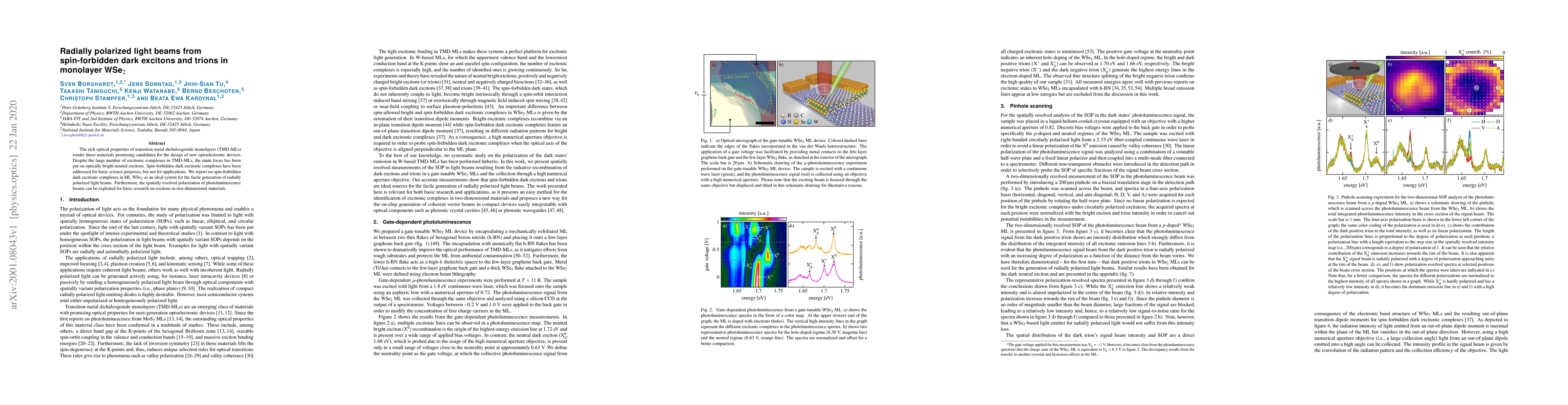The rich optical properties of transition metal dichalcogenide monolayers (TMD-MLs) render these materials promising candidates for the design of new optoelectronic devices. Despite the large number of excitonic complexes in TMD-MLs, the main focus has been put on optically bright neutral excitons. Spin-forbidden dark excitonic complexes have been addressed for basic science purposes, but not for applications. We report on spin-forbidden dark excitonic complexes in ML WSe$_2$ as an ideal system for the facile generation of radially polarized light beams. Furthermore, the spatially resolved polarization of photoluminescence beams can be exploited for basic research on excitons in two-dimensional materials.