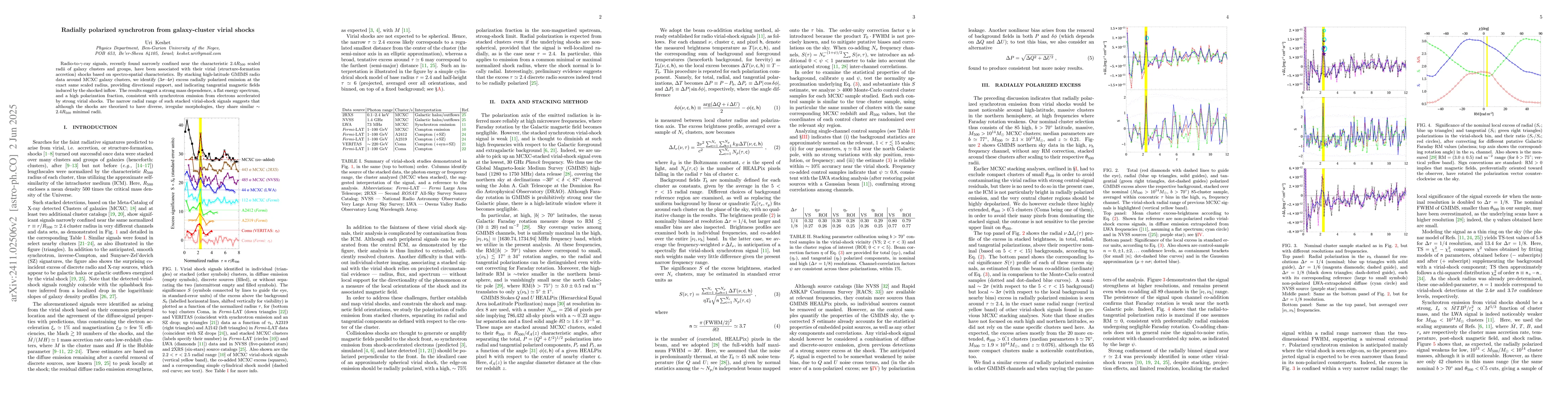 This study identifies radially-polarized synchrotron emission at a characteristic radius in galaxy clusters, indicating tangential magnetic fields from virial shocks. The findings suggest strong mass dependence and a uniform minimal shock radius of approximately 2.4 times the virial radius, consistent with electrons accelerated by these shocks.