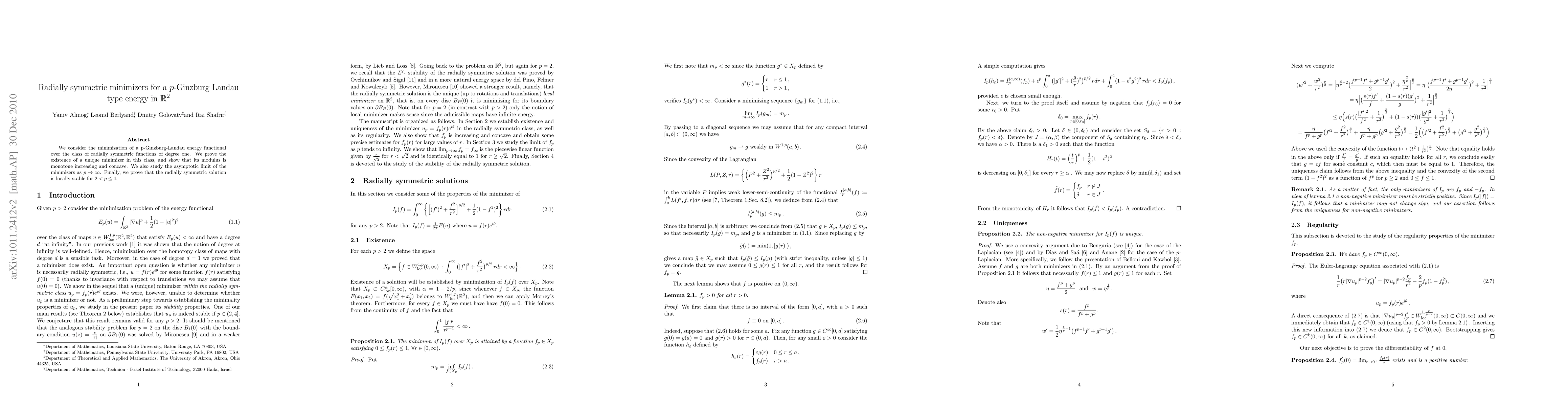 Summary: This paper proves the existence and uniqueness of a radially symmetric minimizer for a $p$-Ginzburg-Landau energy functional in $\R^2$, demonstrating its modulus's monotonicity and concavity. It also examines the behavior of minimizers as $p$ approaches infinity and confirms the local stability of the radial solution for $p$ in $(2,4]$.