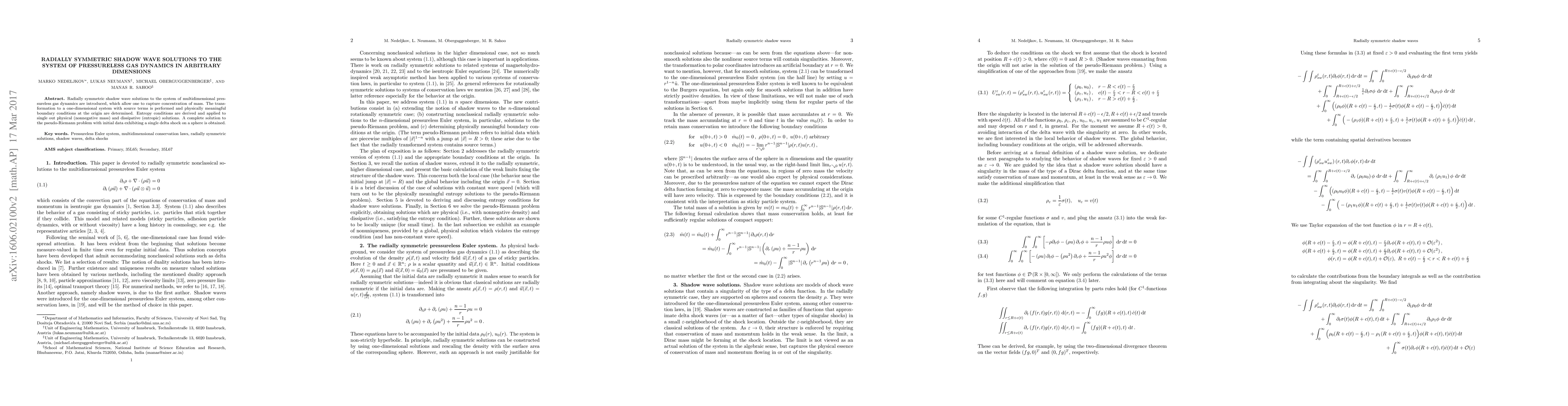 This paper introduces radially symmetric shadow wave solutions for multidimensional pressureless gas dynamics, transforming the problem into a one-dimensional system with source terms. It derives entropy conditions to distinguish physical and dissipative solutions, ultimately solving the pseudo-Riemann problem with a single shock on a sphere.