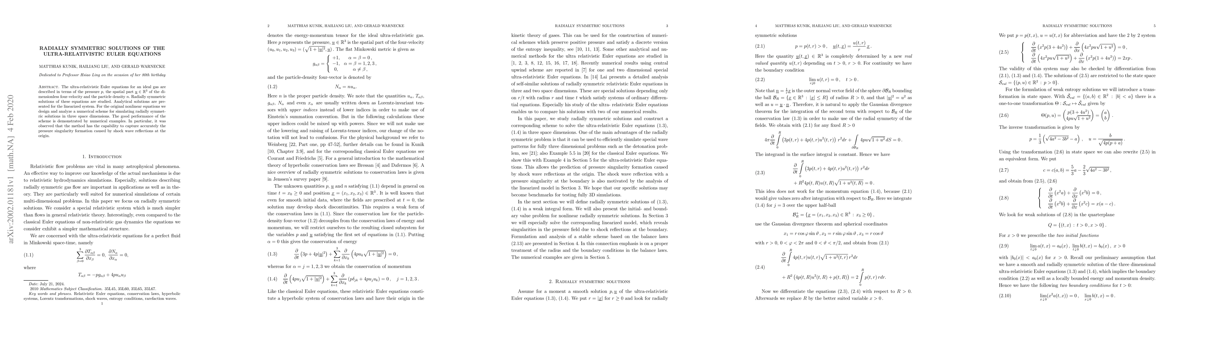 This paper studies radially symmetric solutions to the ultra-relativistic Euler equations for an ideal gas, presenting analytical solutions for the linearized system and a numerical scheme for the nonlinear equations. The numerical scheme accurately captures pressure singularity formation due to shock wave reflections at the origin.