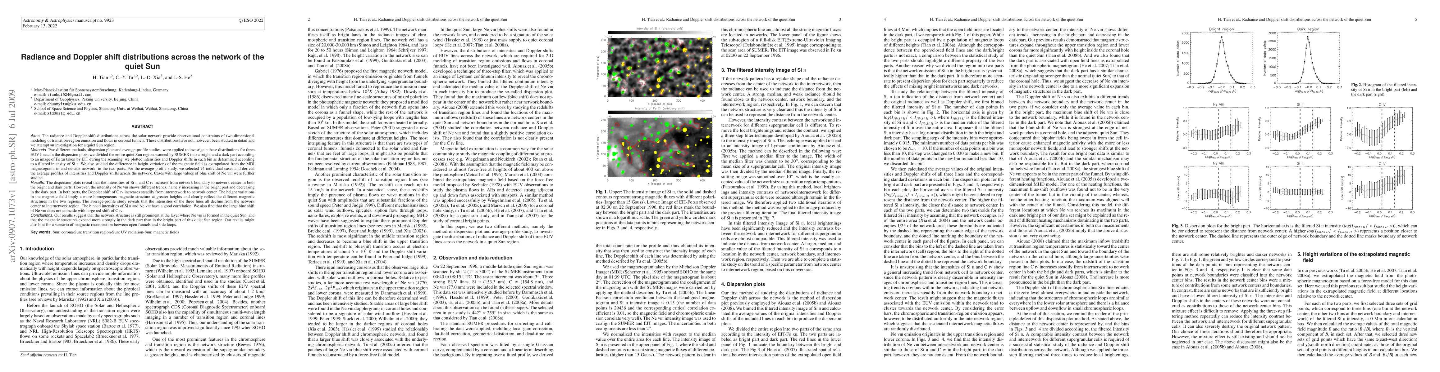 The radiance and Doppler-shift distributions across the solar network provide observational constraints of two-dimensional modeling of transition-region emission and flows in coronal funnels. Two different methods, dispersion plots and average-profile studies, were applied to investigate these distributions. In the dispersion plots, we divided the entire scanned region into a bright and a dark part according to an image of Fe xii; we plotted intensities and Doppler shifts in each bin as determined according to a filtered intensity of Si ii. We also studied the difference in height variations of the magnetic field as extrapolated from the MDI magnetogram, in and outside network. For the average-profile study, we selected 74 individual cases and derived the average profiles of intensities and Doppler shifts across the network. The dispersion plots reveal that the intensities of Si ii and C iv increase from network boundary to network center in both parts. However, the intensity of Ne viii shows different trends, namely increasing in the bright part and decreasing in the dark part. In both parts, the Doppler shift of C iv increases steadily from internetwork to network center. The average-profile study reveals that the intensities of the three lines all decline from the network center to internetwork region. The binned intensities of Si ii and Ne viii have a good correlation. We also find that the large blue shift of Ne viii does not coincide with large red shift of C iv. Our results suggest that the network structure is still prominent at the layer where Ne viii is formed in the quiet Sun, and that the magnetic structures expand more strongly in the dark part than in the bright part of this quiet Sun region.