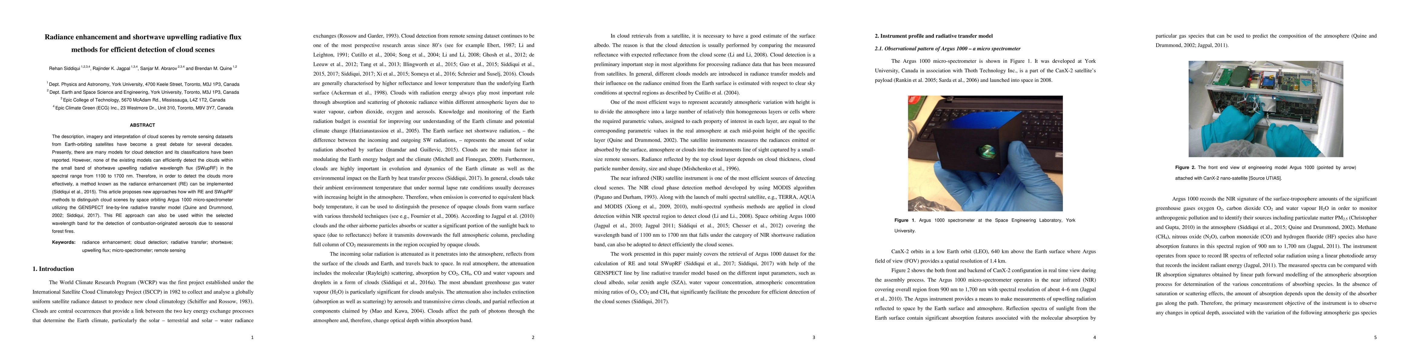 The description, imagery and interpretation of cloud scenes by remote sensing datasets from Earth-orbiting satellites have become a great debate for several decades. Presently, there are many models for cloud detection and its classifications have been reported. However, none of the existing models can efficiently detect the clouds within the small band of shortwave upwelling radiative wavelength flux (SWupRF) in the spectral range from 1100 to 1700 nm. Therefore, in order to detect the clouds more effectively, a method known as the radiance enhancement (RE) can be implemented (Siddiqui et al., 2015). This article proposes new approaches how with RE and SWupRF methods to distinguish cloud scenes by space orbiting Argus 1000 micro-spectrometer utilizing the GENSPECT line-by-line radiative transfer model (Quine and Drummond, 2002; Siddiqui, 2017). This RE approach can also be used within the selected wavelength band for the detection of combustion-originated aerosols due to seasonal forest fires.