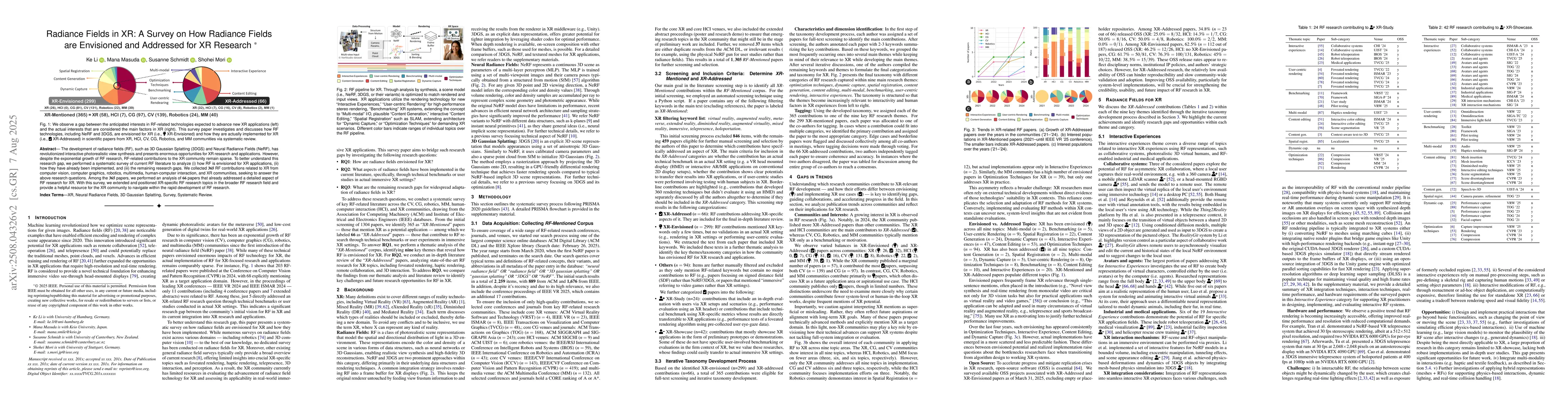 The development of radiance fields (RF), such as 3D Gaussian Splatting (3DGS) and Neural Radiance Fields (NeRF), has revolutionized interactive photorealistic view synthesis and presents enormous opportunities for XR research and applications. However, despite the exponential growth of RF research, RF-related contributions to the XR community remain sparse. To better understand this research gap, we performed a systematic survey of current RF literature to analyze (i) how RF is envisioned for XR applications, (ii) how they have already been implemented, and (iii) the remaining research gaps. We collected 365 RF contributions related to XR from computer vision, computer graphics, robotics, multimedia, human-computer interaction, and XR communities, seeking to answer the above research questions. Among the 365 papers, we performed an analysis of 66 papers that already addressed a detailed aspect of RF research for XR. With this survey, we extended and positioned XR-specific RF research topics in the broader RF research field and provide a helpful resource for the XR community to navigate within the rapid development of RF research.