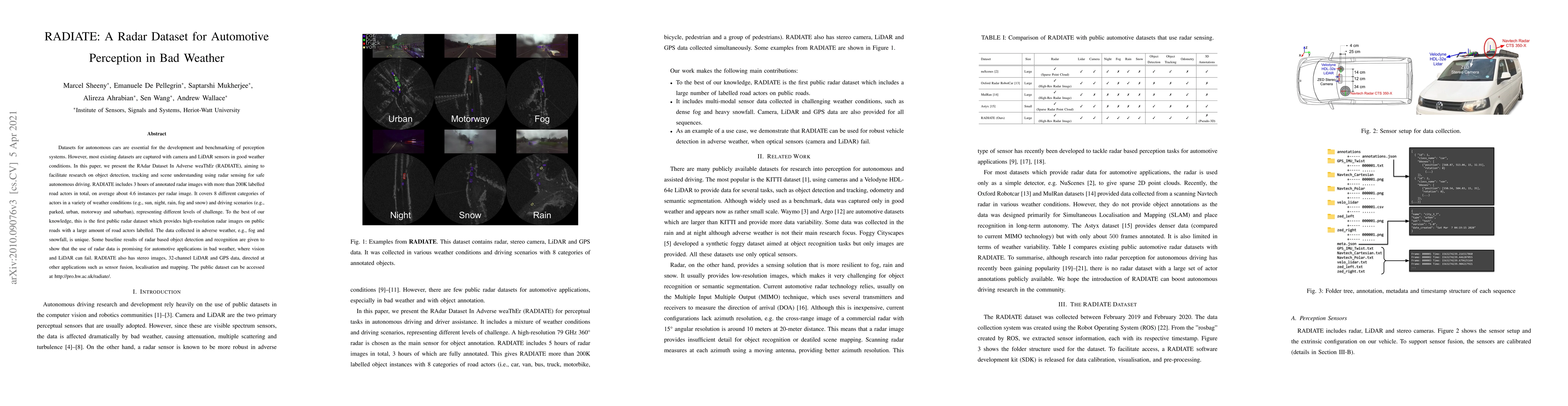 RADIATE is a novel radar dataset for automotive perception in adverse weather, featuring 3 hours of annotated radar images with over 200K labelled road actors across various weather conditions and scenarios. It aims to advance radar-based object detection, tracking, and scene understanding for autonomous driving, offering a unique resource for research in challenging conditions.