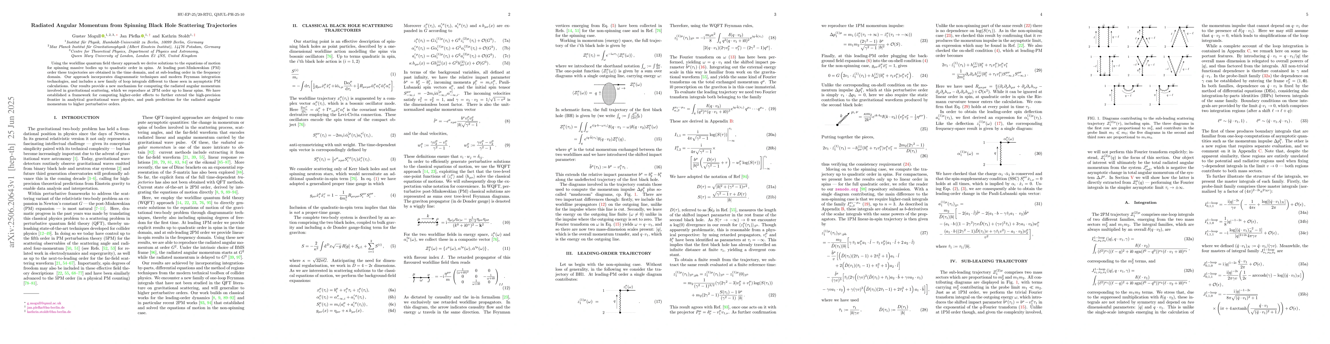 Using the worldline quantum field theory approach we derive solutions to the equations of motion for spinning massive bodies up to quadratic order in spins. At leading post-Minkowskian (PM) order these trajectories are obtained in the time domain, and at sub-leading order in the frequency domain. Our approach incorporates diagrammatic techniques and modern Feynman integration technologies, and includes a new family of loop integrals different to those seen in asymptotic PM calculations. Our results provide a new mechanism for computing the radiated angular momentum involved in gravitational scattering, which we reproduce at 2PM order up to linear spins. We have established a framework for computing higher-order effects to further extend the high-precision frontier in analytical gravitational wave physics, and push predictions for the radiated angular momentum to higher perturbative orders.