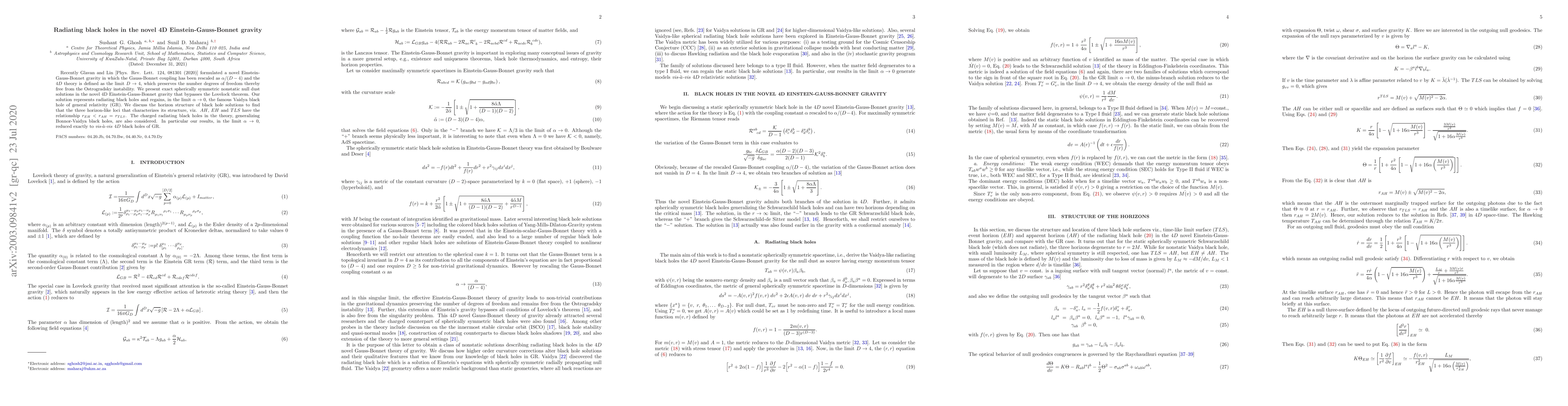 This paper investigates exact solutions for radiating black holes in novel 4D Einstein-Gauss-Bonnet gravity, presenting nonstatic null dust solutions that generalize Vaidya black holes of general relativity. The horizon structure is analyzed, showing three horizon-like loci with specific relationships.