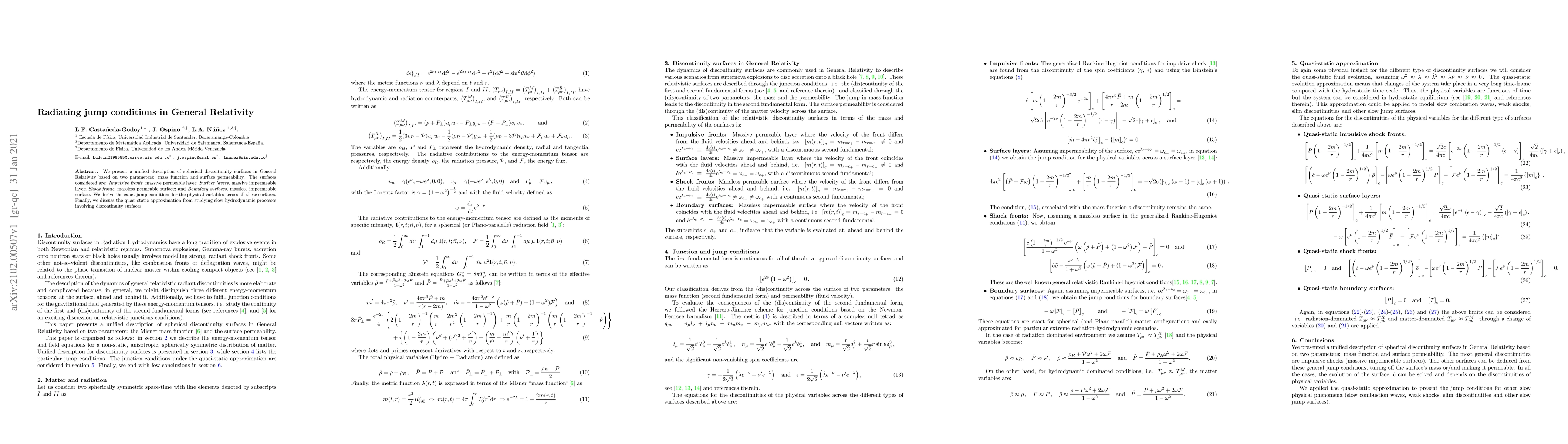 We present a unified description of spherical discontinuity surfaces in General Relativity based on two parameters: mass function and surface permeability. The surfaces considered are: \textit{Impulsive fronts}, massive permeable layer; \textit{Surface layers}, massive impermeable layer; \textit{Shock fronts}, massless permeable surface; and \textit{Boundary surfaces}, massless impermeable surface. We derive the exact jump conditions for the physical variables across all these surfaces. Finally, we discuss the quasi-static approximation from studying slow hydrodynamic processes involving discontinuity surfaces.