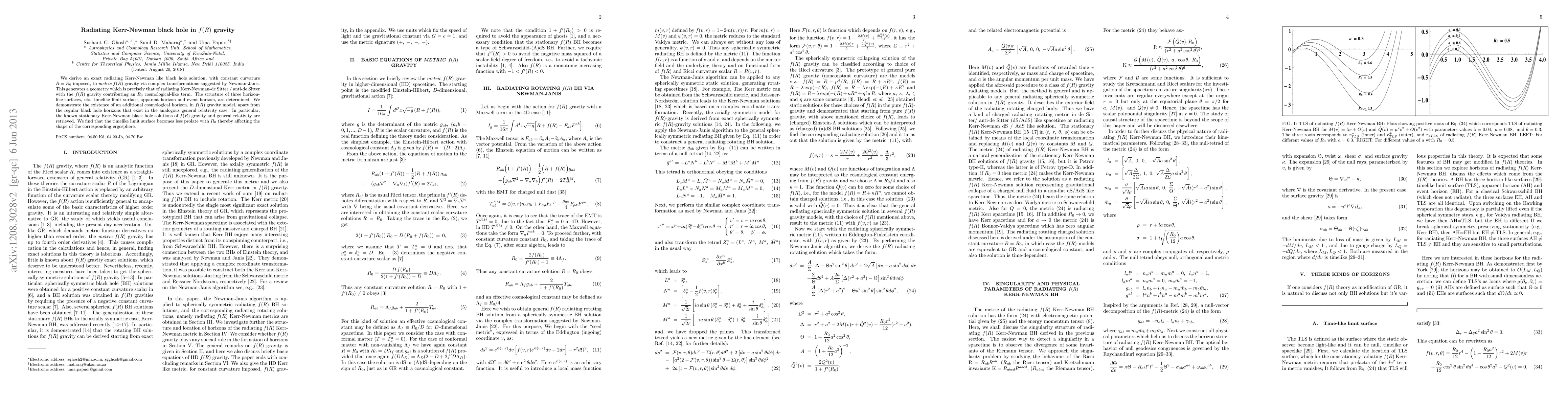 We derive an exact radiating Kerr-Newman like black hole solution, with constant curvature $R=R_0$ imposed, to {\it metric} $f(R)$ gravity via complex transformations suggested by Newman-Janis. This generates a geometry which is precisely that of radiating Kerr-Newman-de Sitter / anti-de Sitter with the $f(R)$ gravity contributing an $R_0$ cosmological-like term. The structure of three horizon-like surfaces, {\it viz.} timelike limit surface, apparent horizon and event horizon, are determined. We demonstrate the existence of an additional cosmological horizon, in $f(R)$ gravity model, apart from the regular black hole horizons that exist in the analogous general relativity case. In particular, the known stationary Kerr-Newman black hole solutions of $f(R)$ gravity and general relativity are retrieved. We find that the timelike limit surface becomes less prolate with $R_0$ thereby affecting the shape of the corresponding ergosphere.