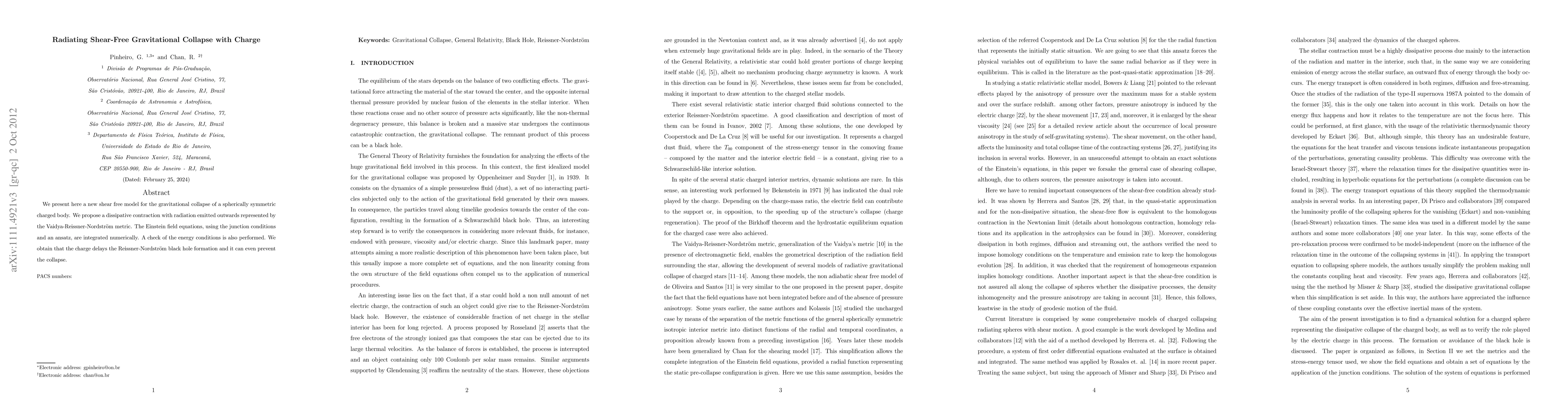 This paper proposes a new shear-free model for the gravitational collapse of a charged, spherically symmetric body, incorporating outward radiation and numerical integration of the Einstein field equations. The study finds that the charge can delay or even halt black hole formation.