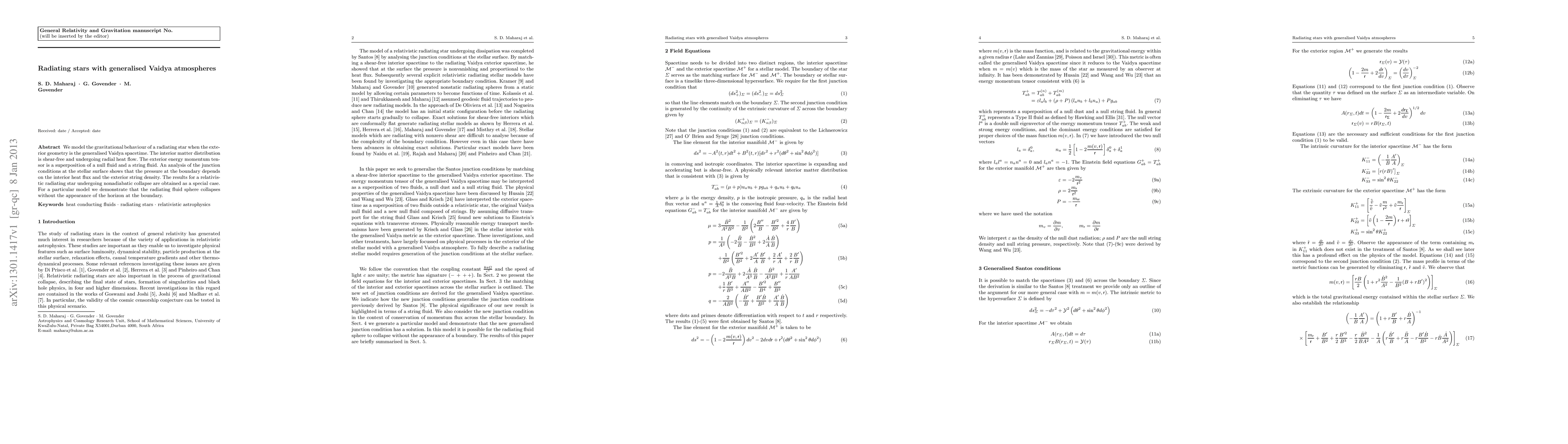 Researchers model the gravitational behavior of radiating stars using a generalized Vaidya spacetime, finding that the pressure at the stellar boundary depends on interior heat flux and exterior string density.