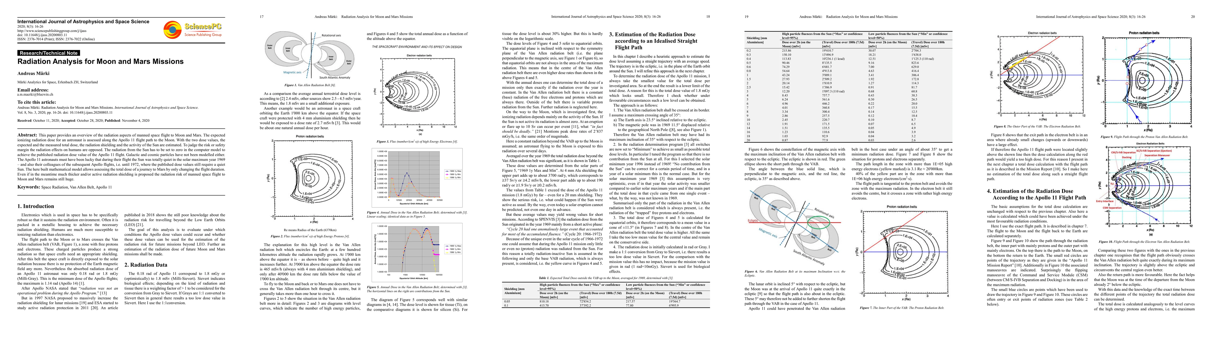 This paper provides an overview of the radiation aspects of manned space flight to Moon and Mars. The expected ionizing radiation dose for an astronaut is assessed along the Apollo 11 flight path to the Moon. With the two dose values, the expected and the measured total dose, the radiation shielding and the activity of the Sun are estimated. To judge the risk or safety margin the radiation effects on humans are opposed. The radiation from the Sun has to be set to zero in the computer model to achieve the published radiation dose value of the Apollo 11 flight. Galactic and cosmic particles have not been modelled either. The Apollo 11 astronauts must have been lucky that during their flight the Sun was totally quiet in the solar maximum year 1969 - and also their colleagues of the subsequent Apollo flights, i.e. until 1972, where the published dose values still require a quiet Sun. The here built mathematical model allows assessing the total dose of a journey to Mars by only changing the flight duration. Even if in the meantime much thicker and/or active radiation shielding is proposed the radiation risk of manned space flight to Moon and Mars remains still huge.
