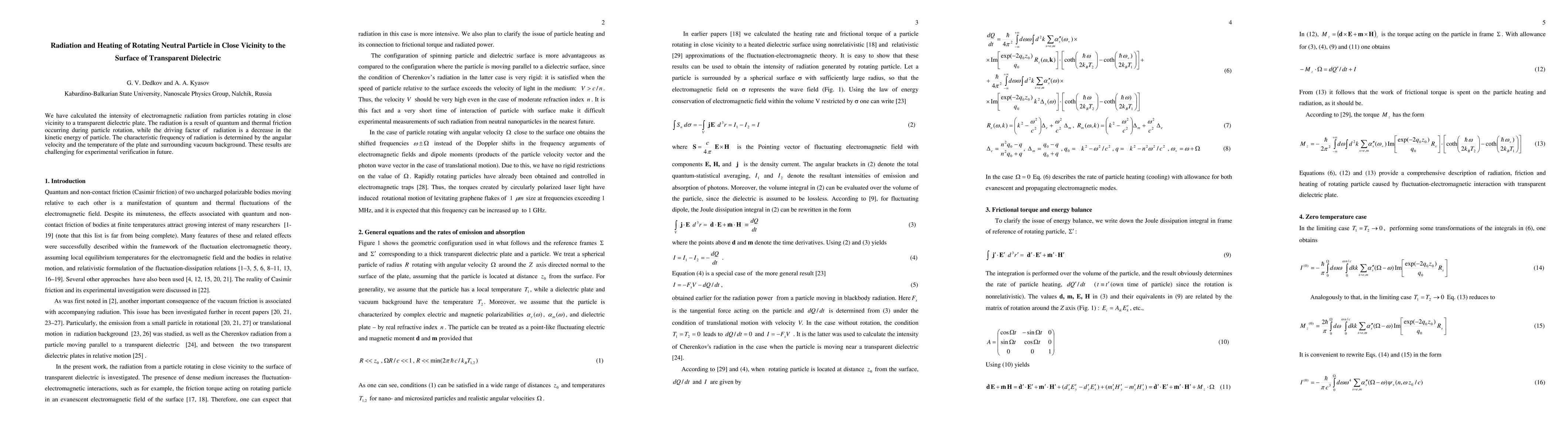 Summary: This paper calculates electromagnetic radiation from rotating neutral particles near a transparent dielectric, attributing it to quantum and thermal friction. The radiation's frequency depends on the particle's angular velocity and the temperature of the dielectric and surrounding vacuum, posing challenges for future experimental validation.