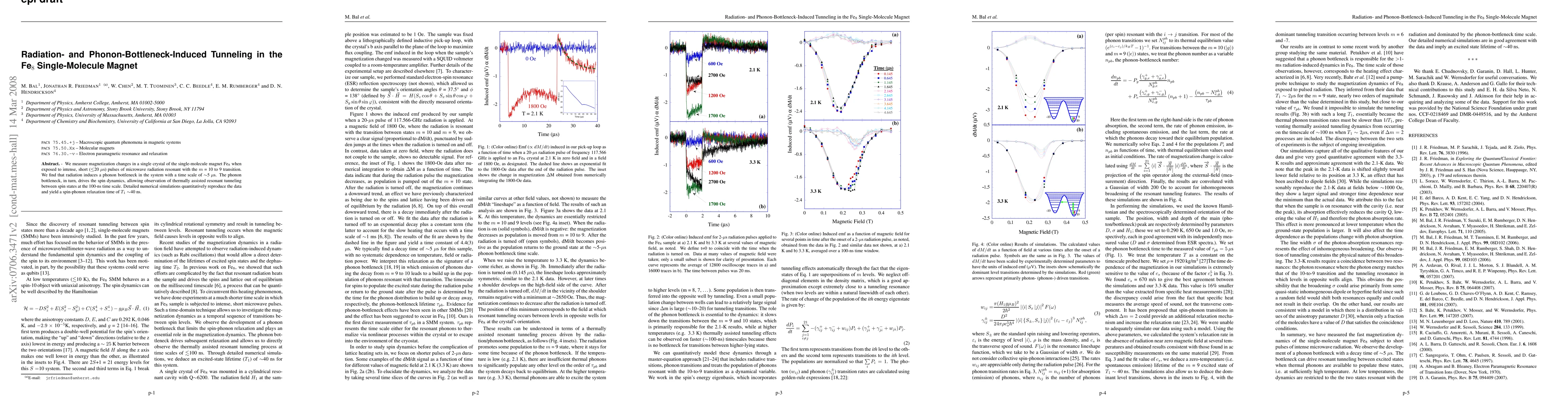 This study investigates magnetization changes in Fe8 single-molecule magnets under microwave radiation, revealing a phonon bottleneck effect that facilitates thermally assisted resonant tunneling between spin states. Numerical simulations confirm the spin-phonon relaxation time of approximately 40 ns.