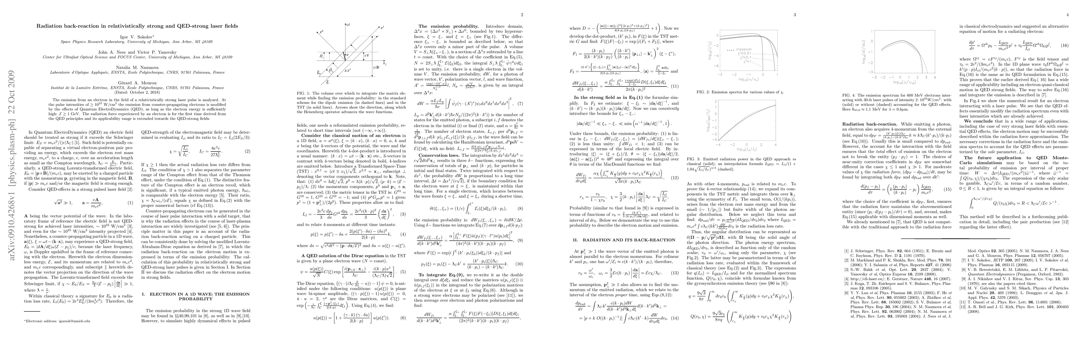 This paper analyzes electron emission in relativistically strong laser fields, revealing QED modifications in emission from counter-propagating electrons at high energies (\(\ge 1\) GeV). It derives the radiation force on electrons from QED principles, extending its applicability to QED-strong fields.